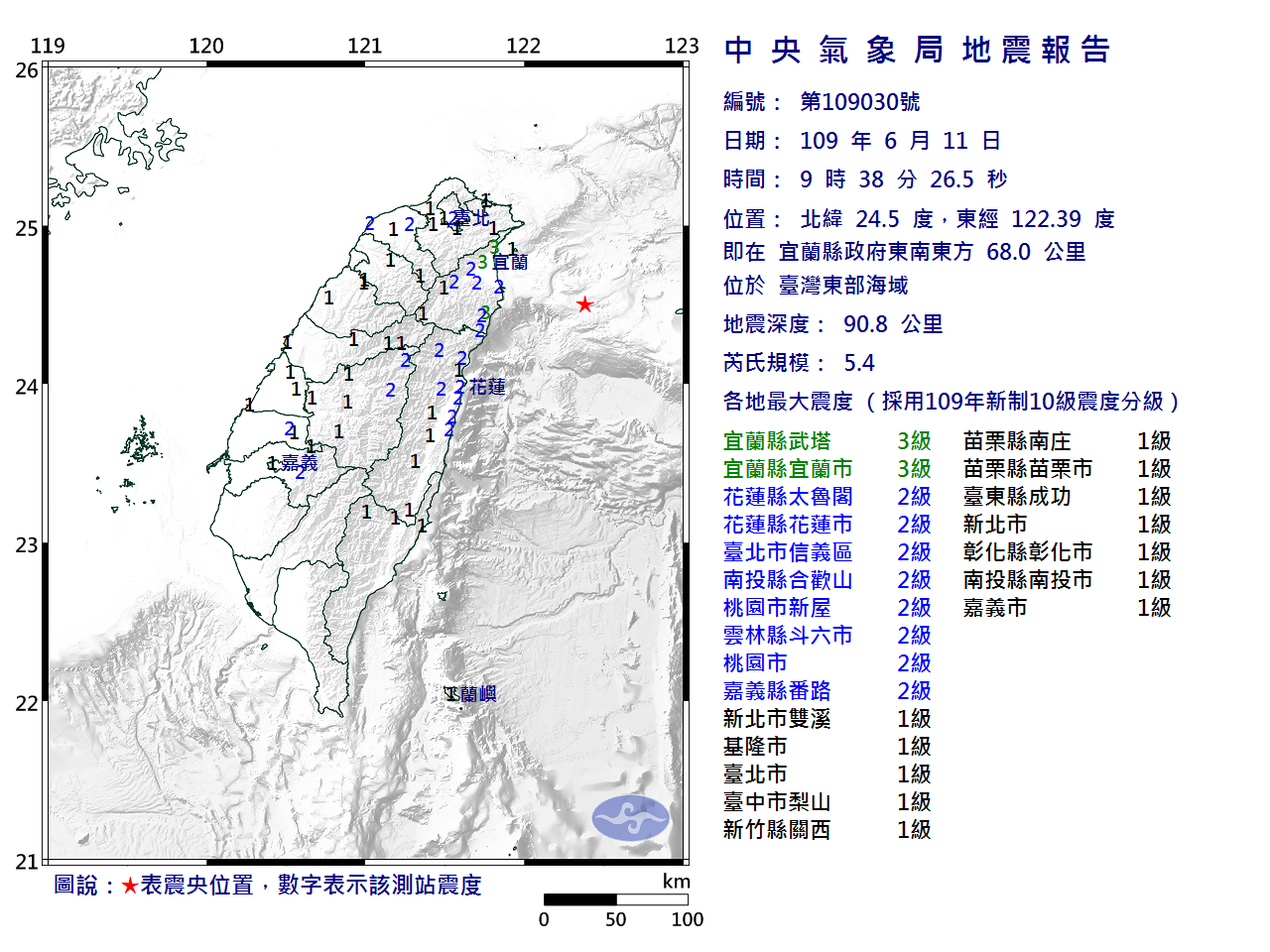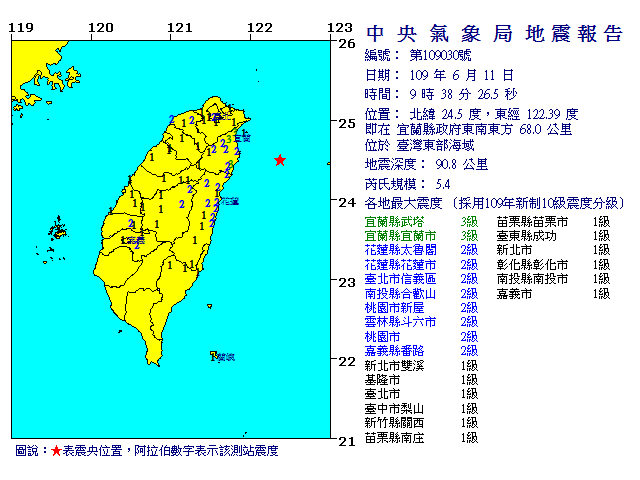 | 發 震 時 間: | 109年 6月11日 9時38分26.5秒 |