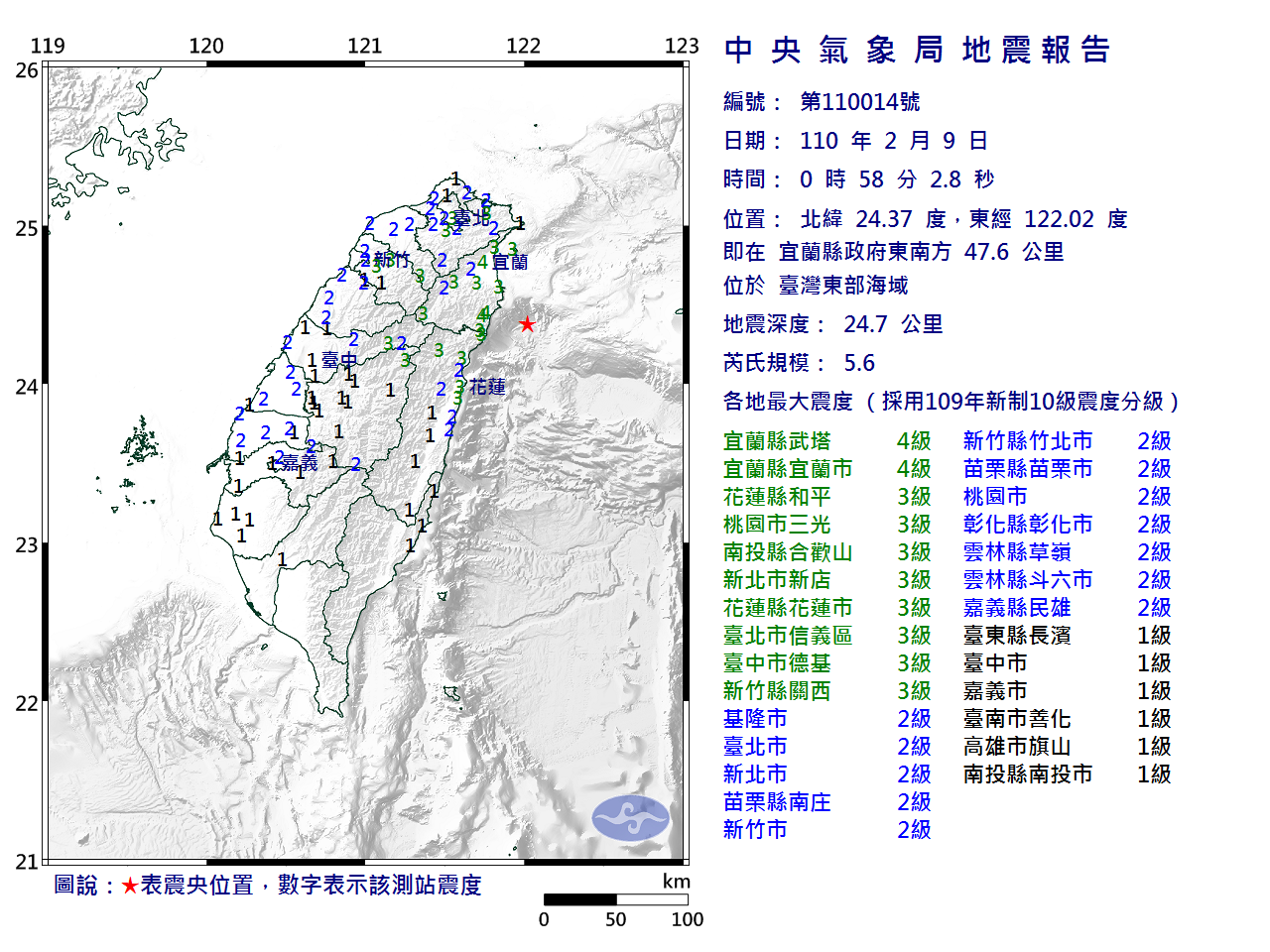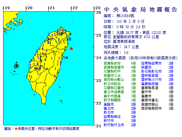 | 發 震 時 間: | 110年 2月 9日 0時58分 2.8秒 |