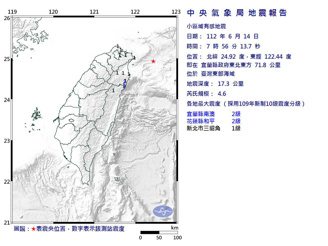 | 發 震 時 間: | 112年 6月14日 7時56分13.7秒 |