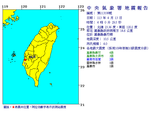 | 嘉義縣地區最大震度 4級 | 臺南市地區最大震度 2級 | 雲林縣地區最大震度 1級 |