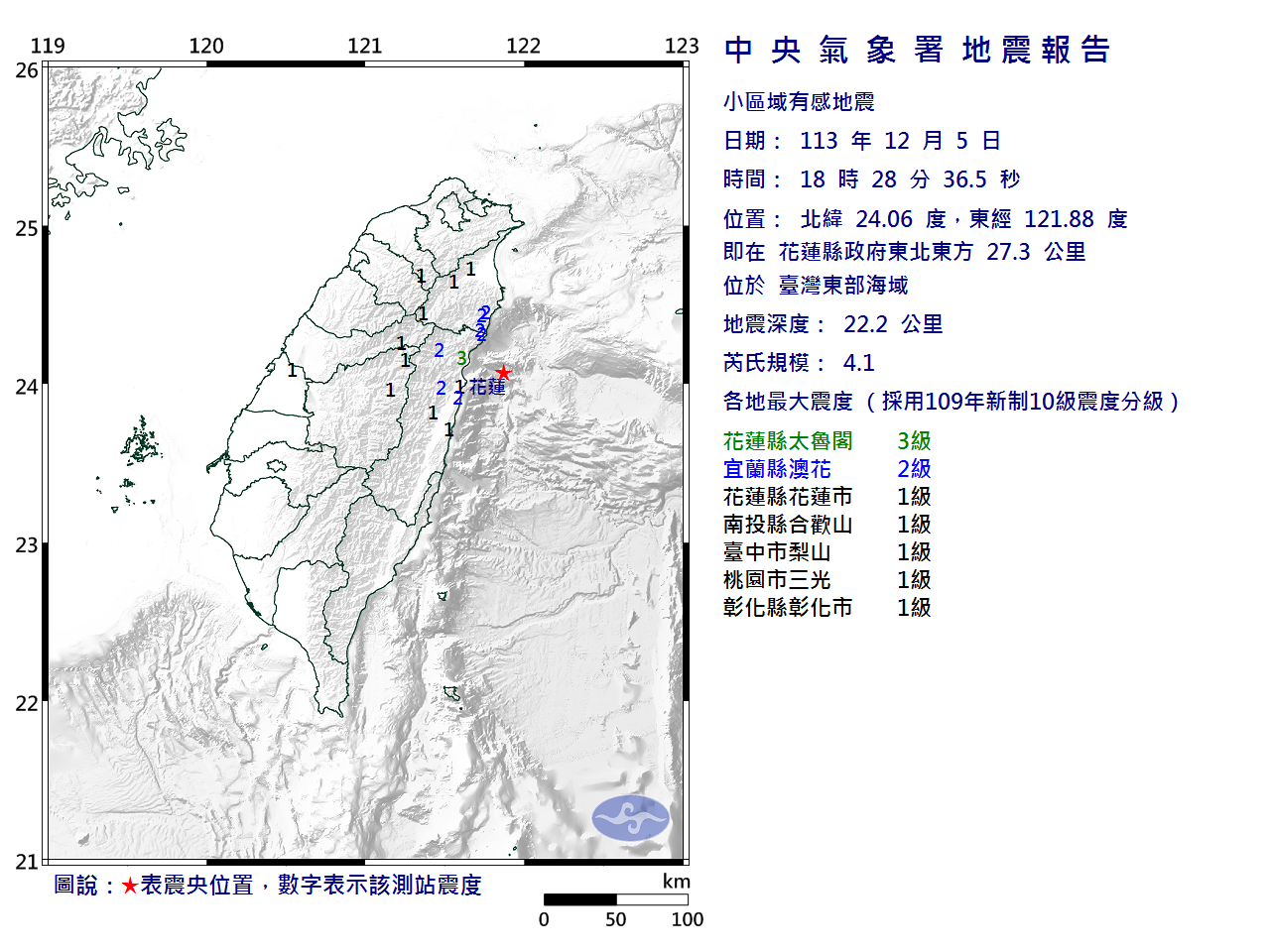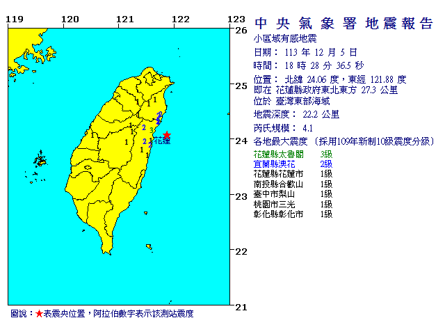 | 發 震 時 間: | 113年12月 5日18時28分36.5秒 |