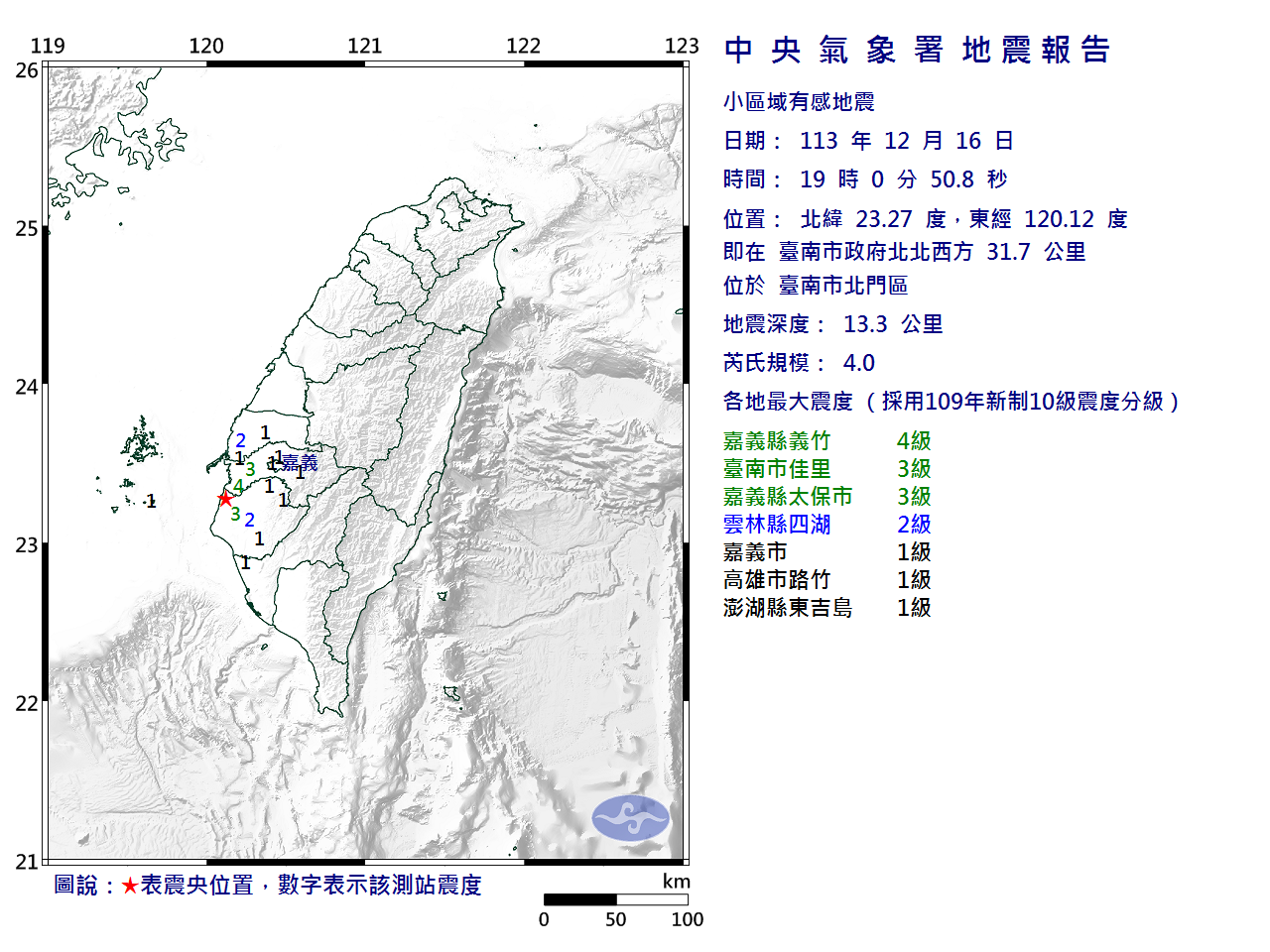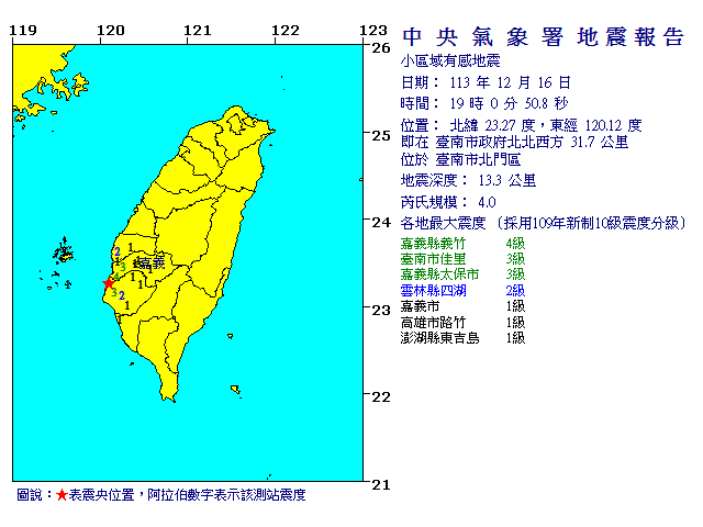 | 嘉義縣地區最大震度 4級 | 臺南市地區最大震度 3級 | 雲林縣地區最大震度 2級 |