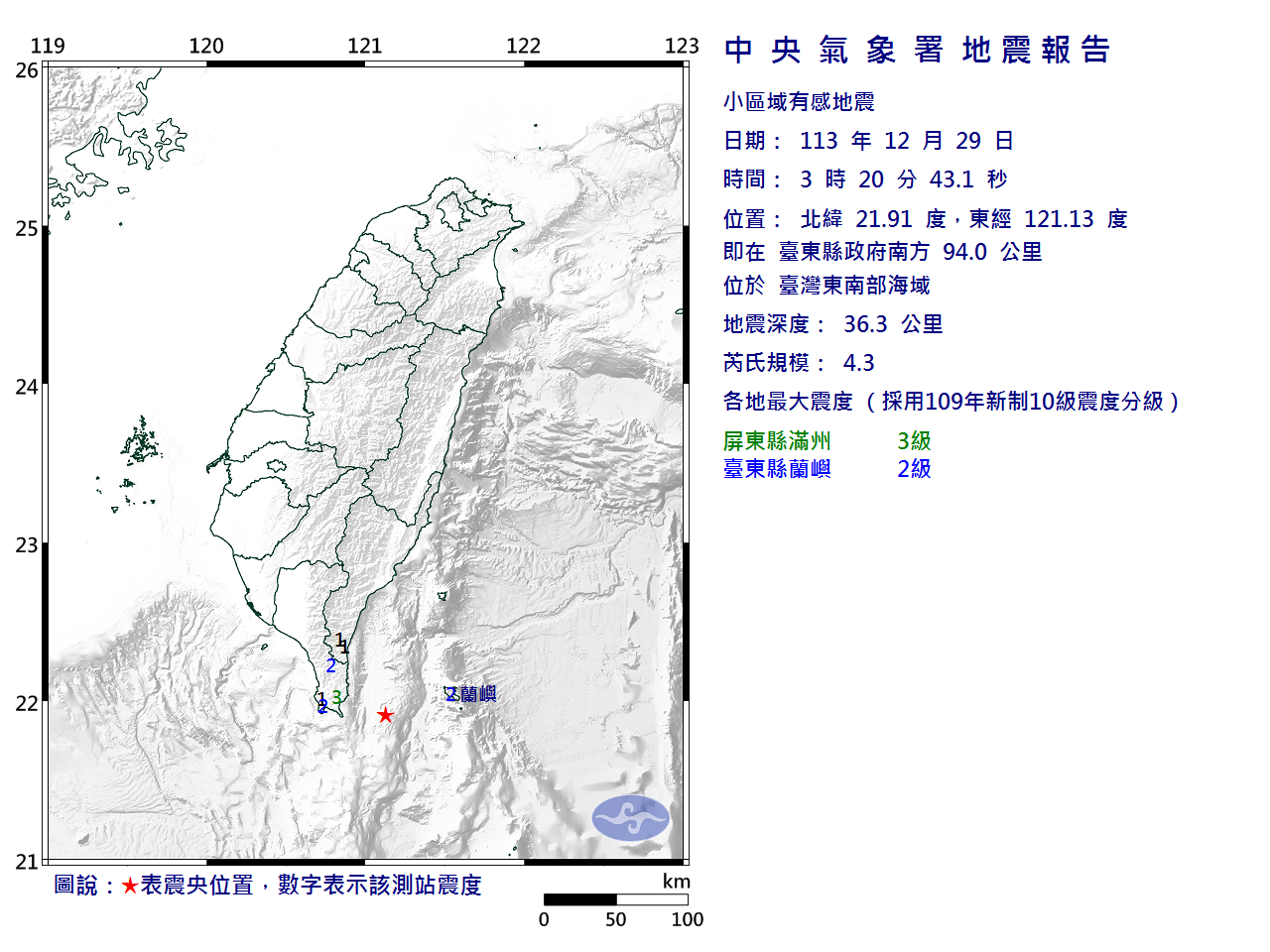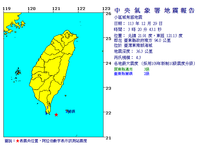 | 發 震 時 間: | 113年12月29日 3時20分43.1秒 |