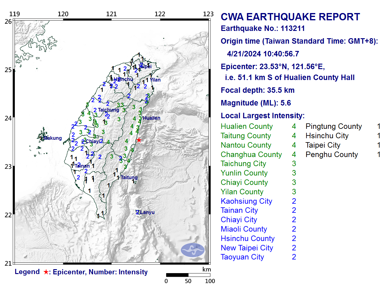 Origin Time:2024/04/21 10:40:56 Lon:121.56°E Lat:23.53°N Depth:35.5km