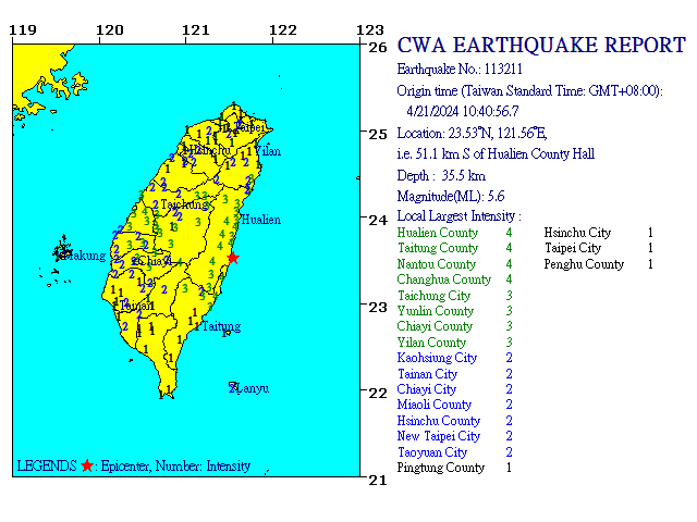 第211號 4月21日10時40分 規模 5.6 23.53N 121.56E, i.e. 51.1 km S of Hualien County