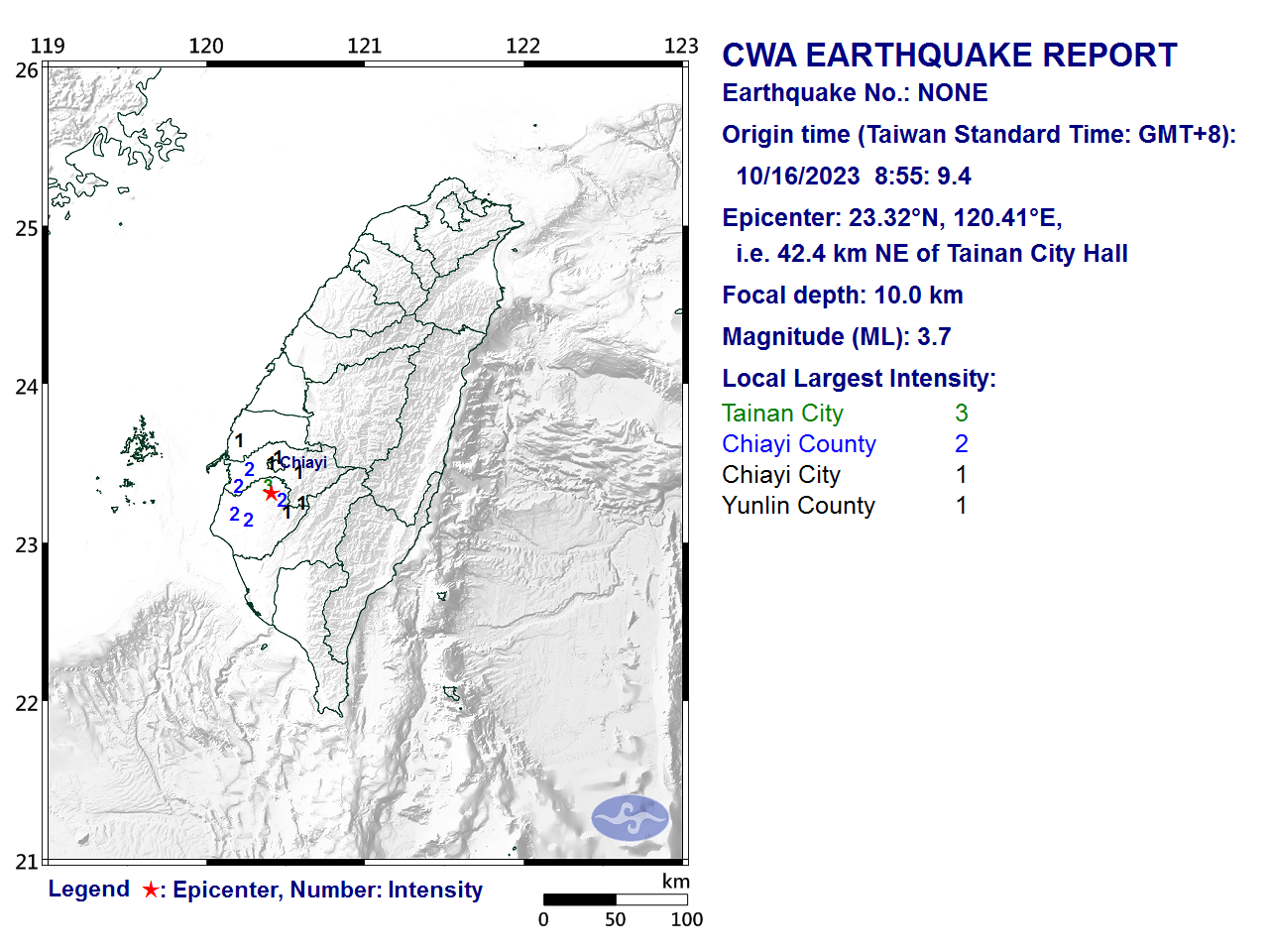 10月16日8時55分 規模 3.7 23.32N 120.41E, i.e. 42.4 km NE of Tainan City
