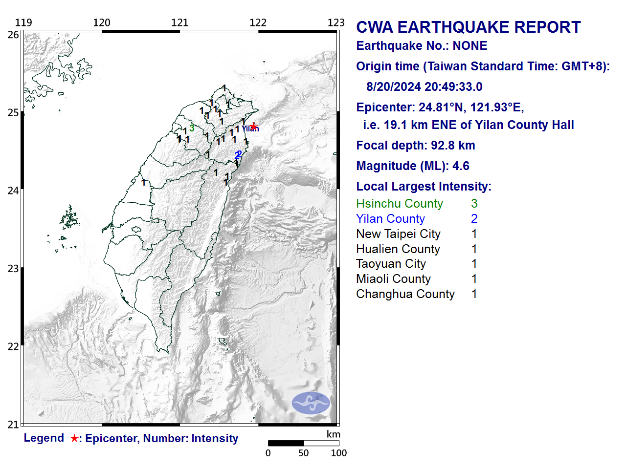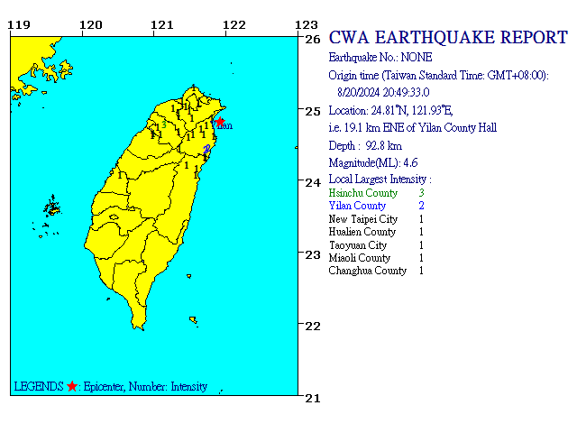 8月20日20時49分 規模 4.6 24.81N 121.93E, i.e. 19.1 km ENE of Yilan County