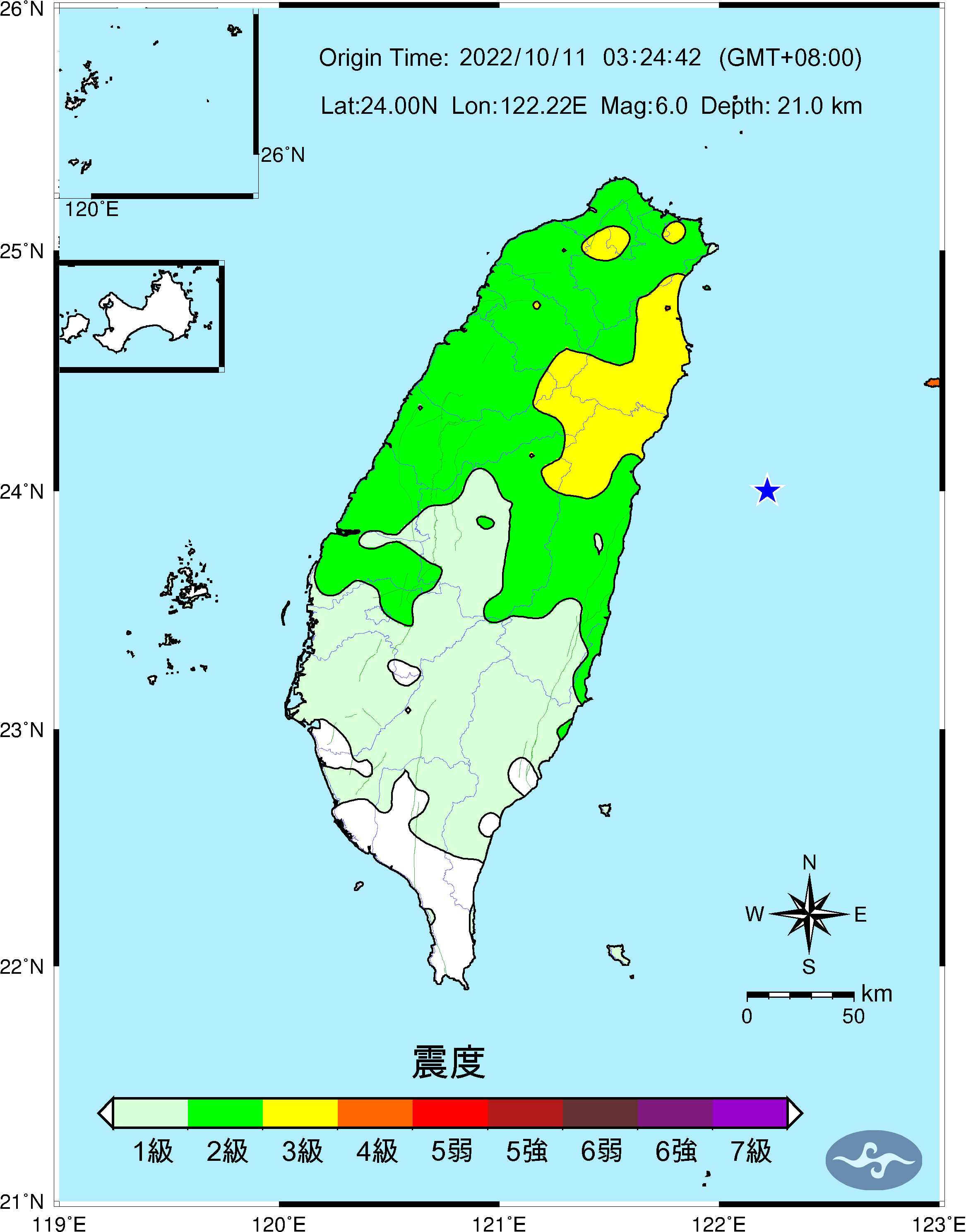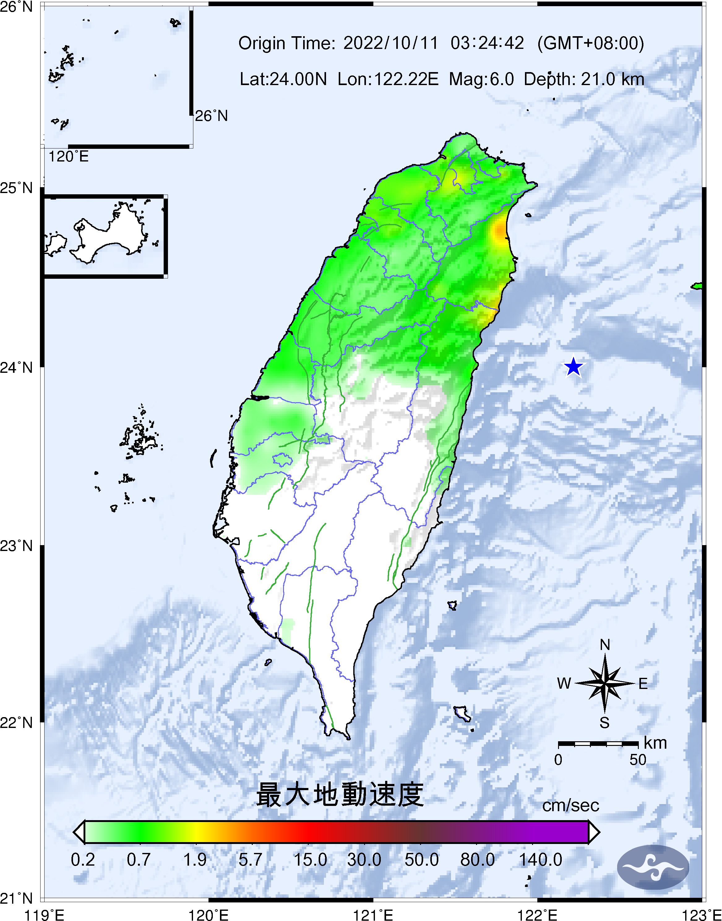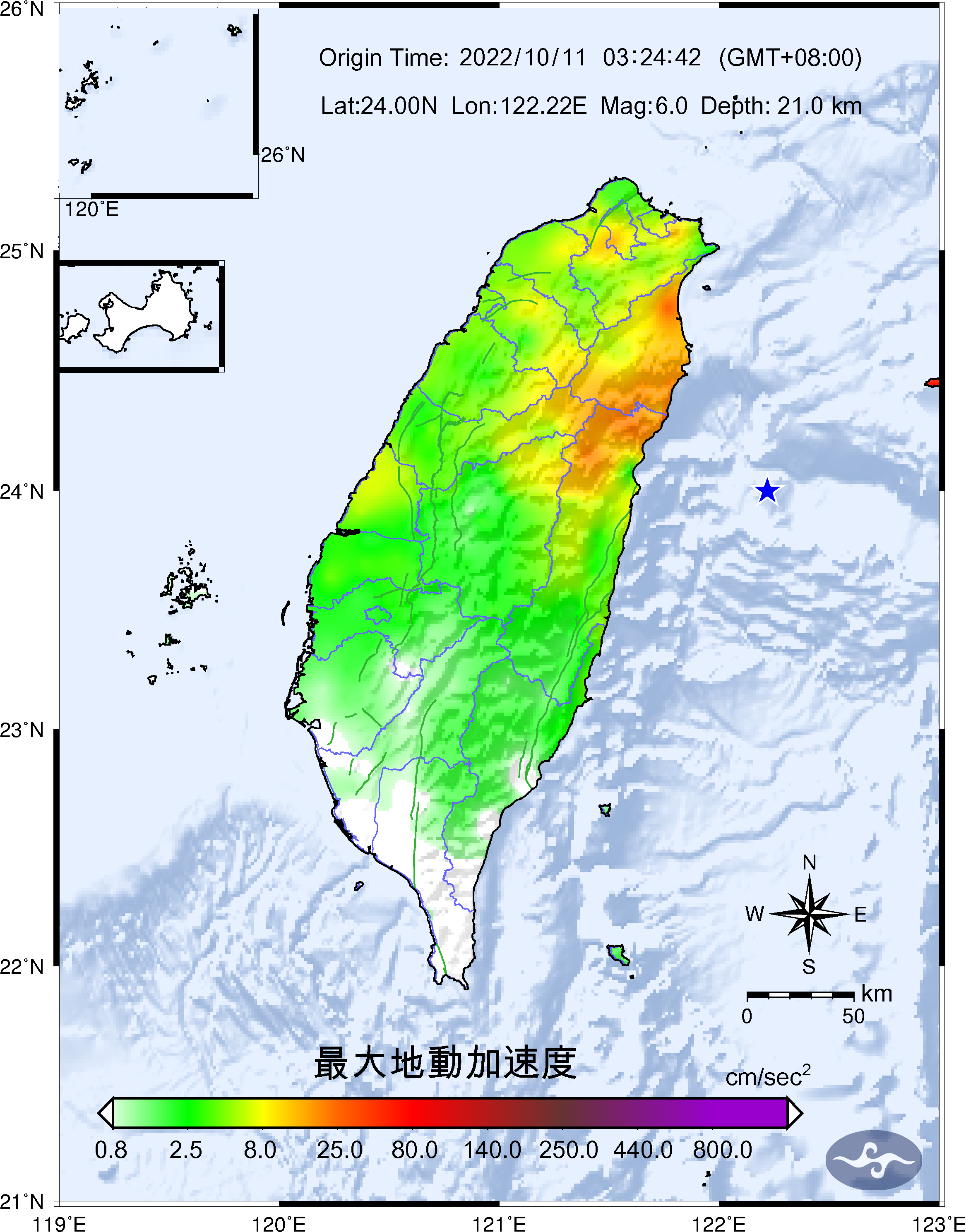 Origin Time:2022/10/11 03:24:42 Lon:122.22°E Lat:24.00°N Depth:21.0km