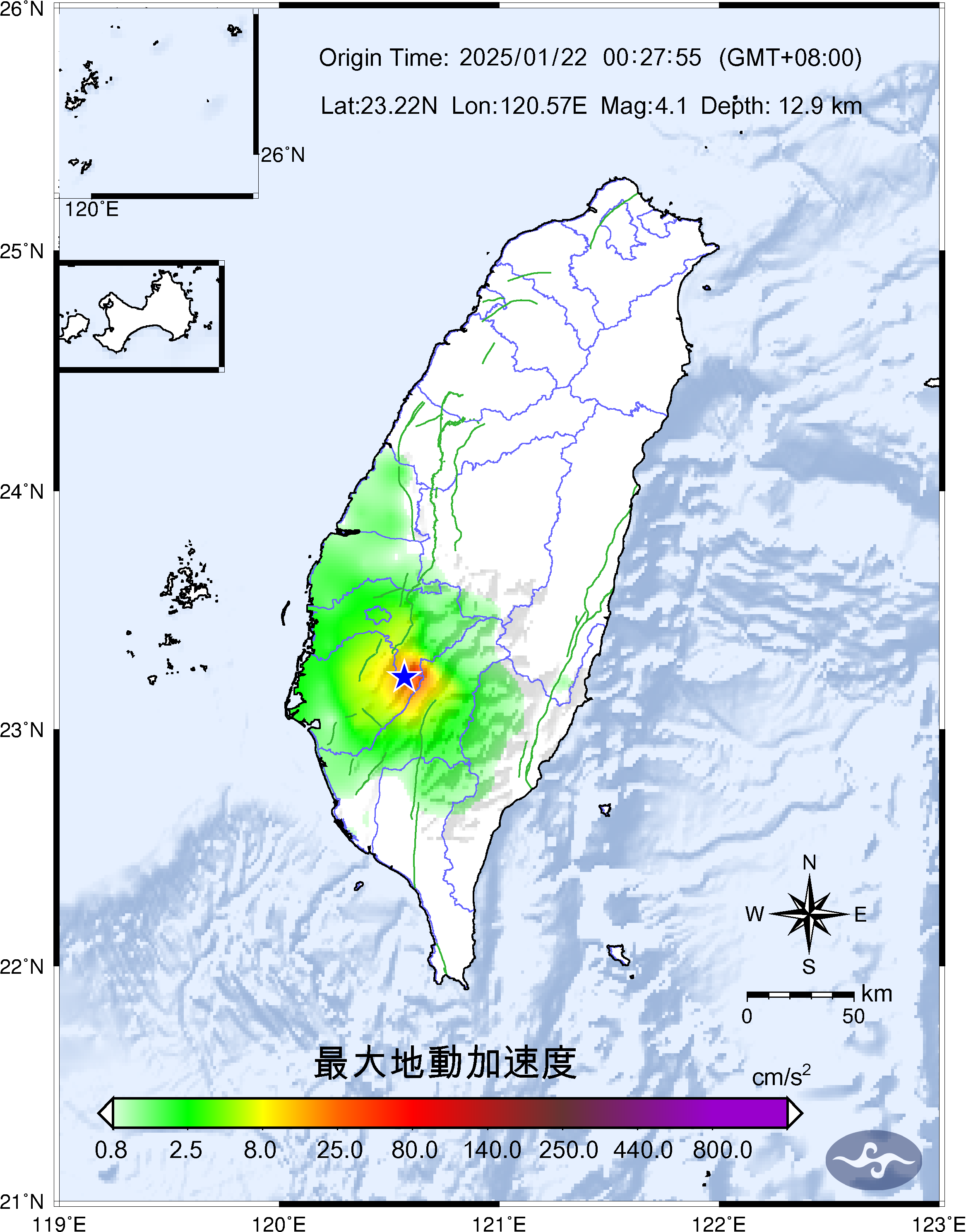Origin Time:2025/01/22 00:27:55 Lon:120.57°E Lat:23.22°N Depth:12.9km