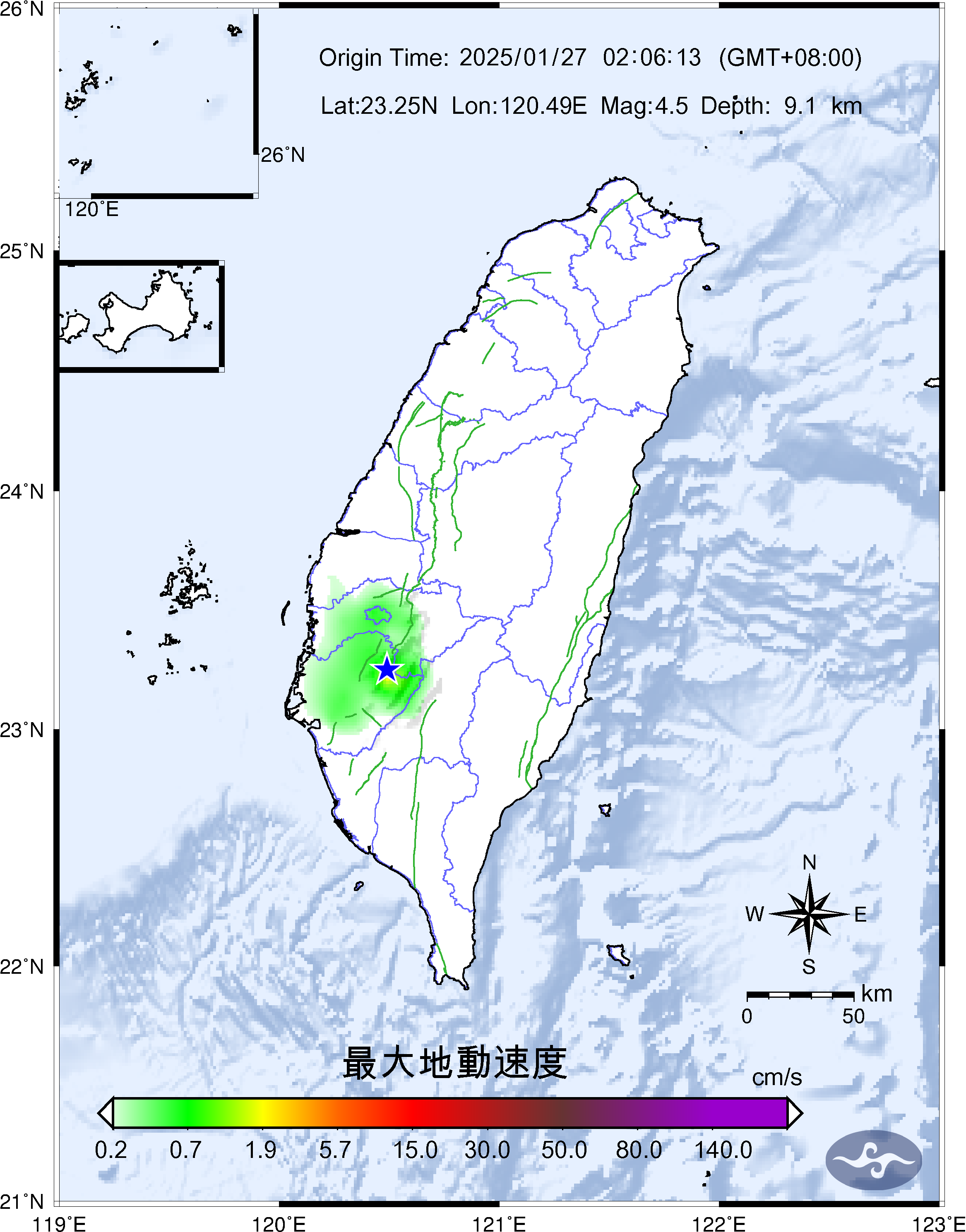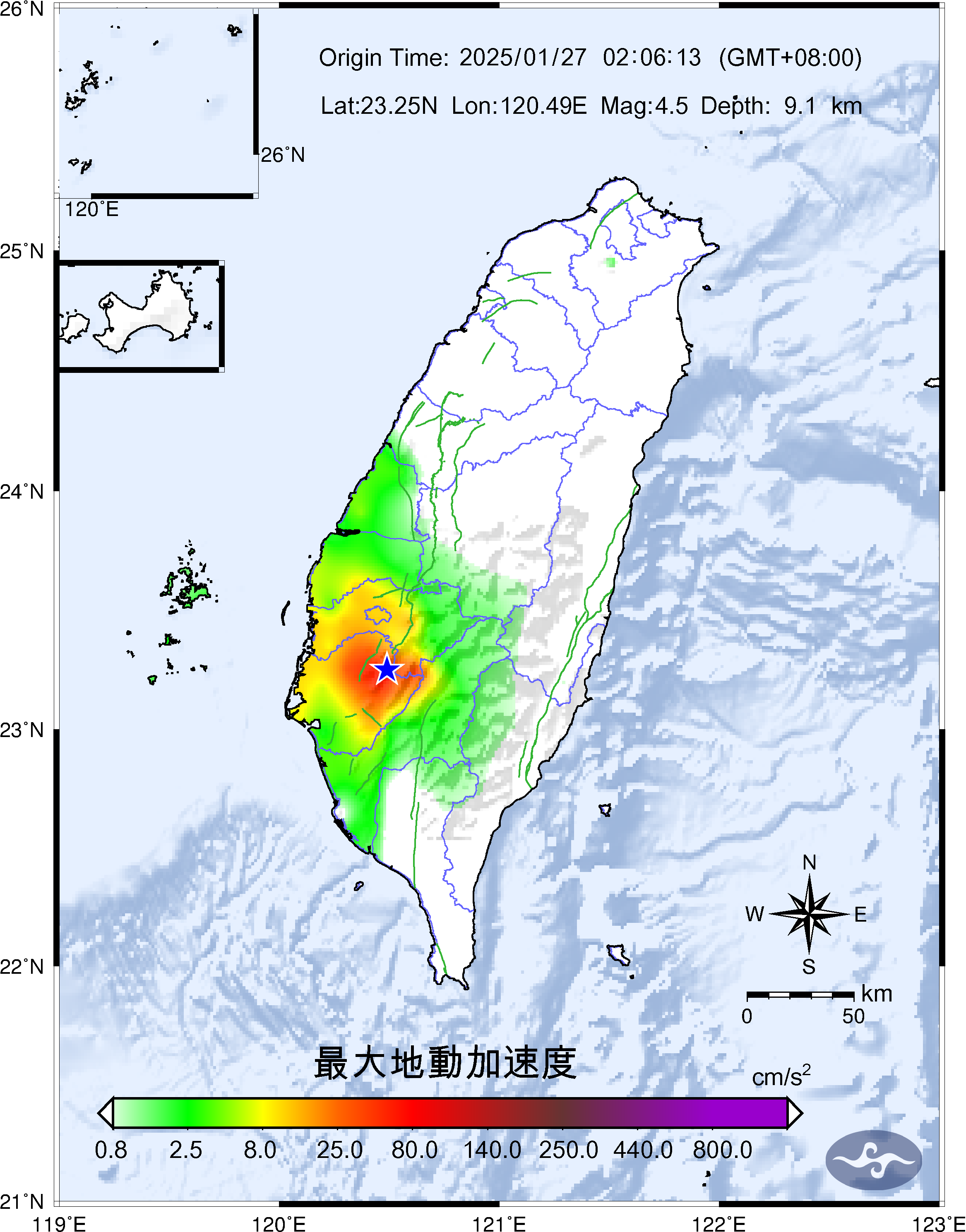 Origin Time:2025/01/27 02:06:13 Lon:120.49°E Lat:23.25°N Depth:9.1km