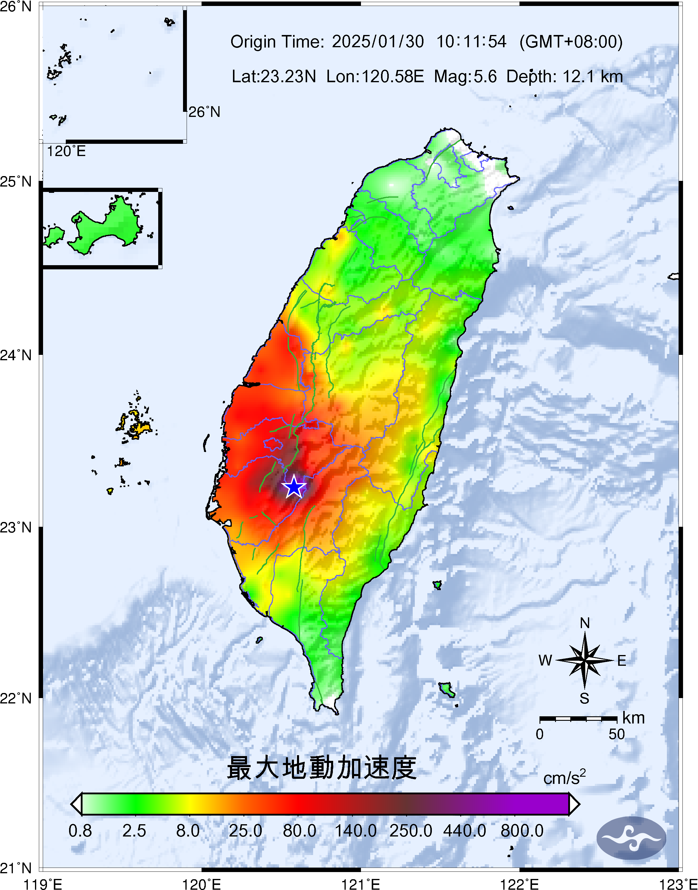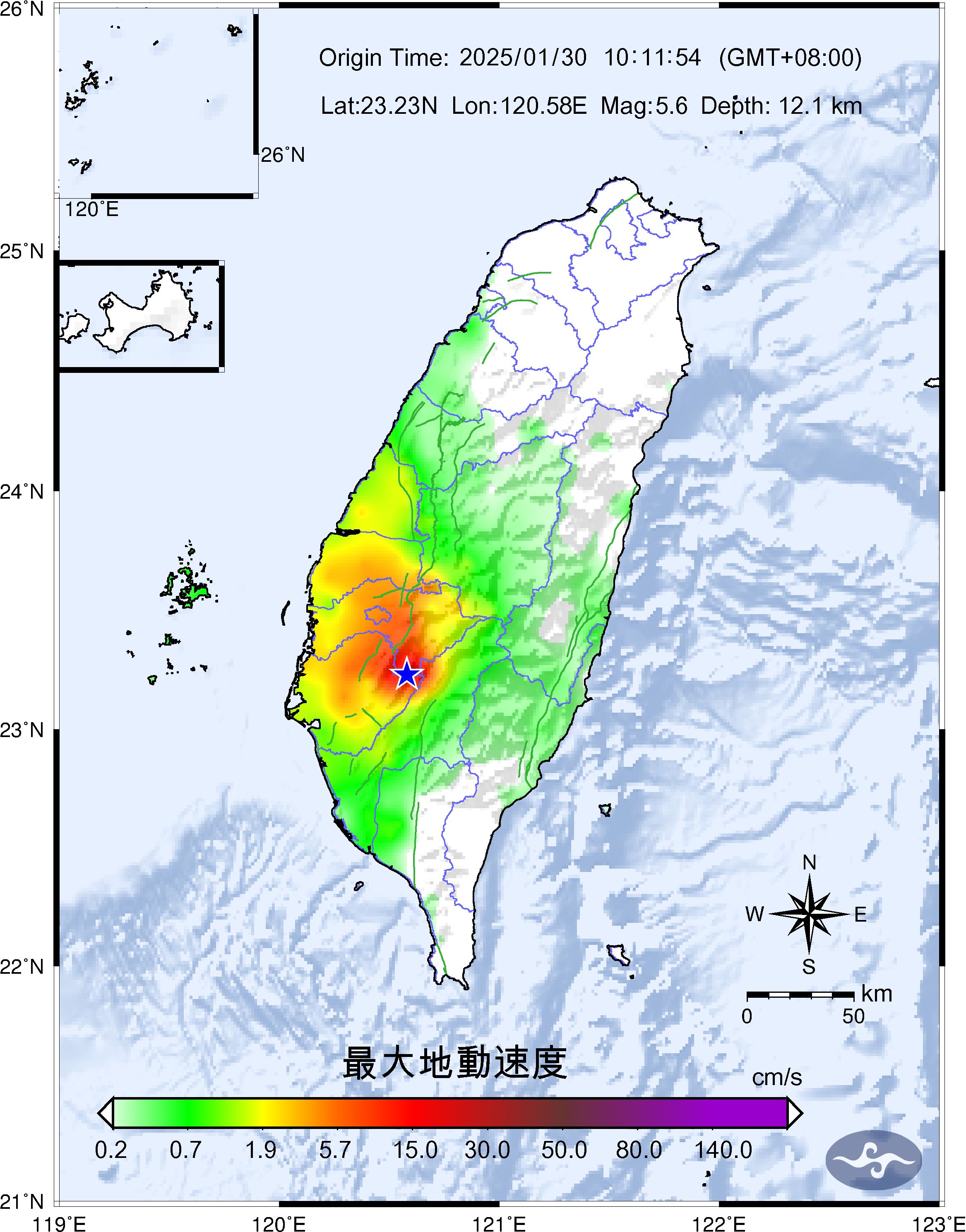Origin Time:2025/01/30 10:11:54 Lon:120.58°E Lat:23.23°N Depth:12.1km