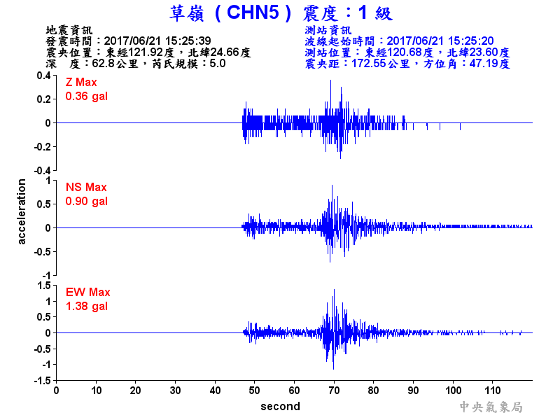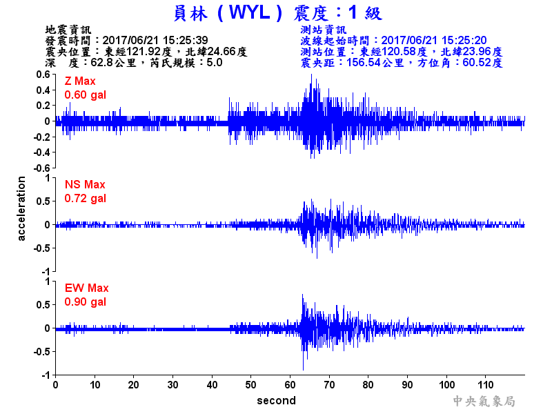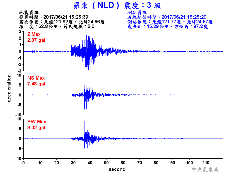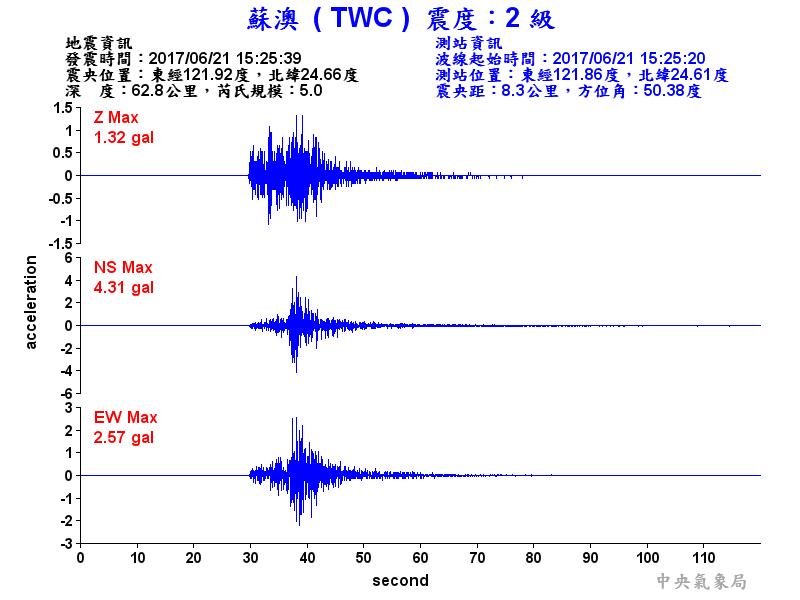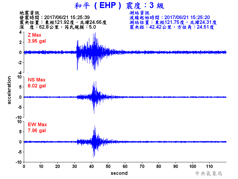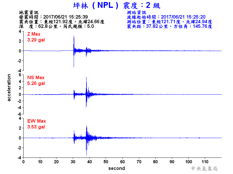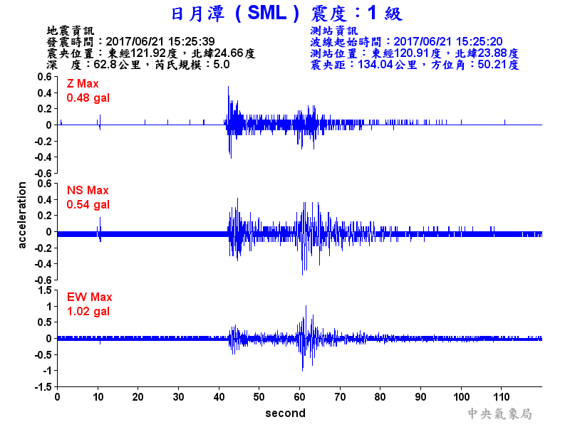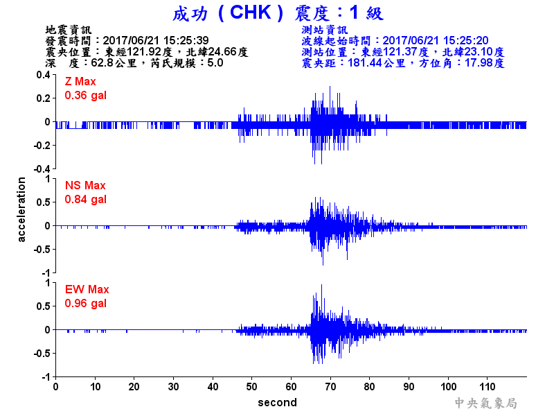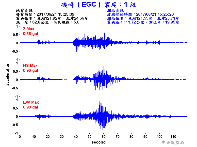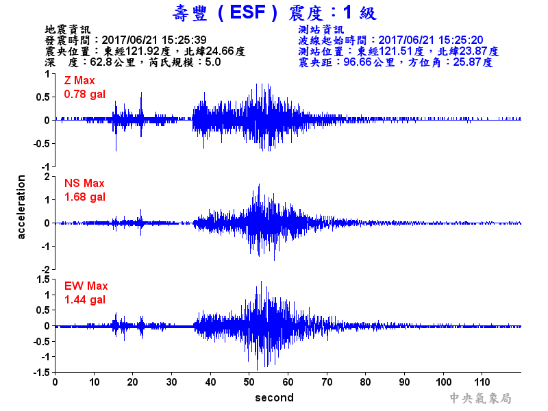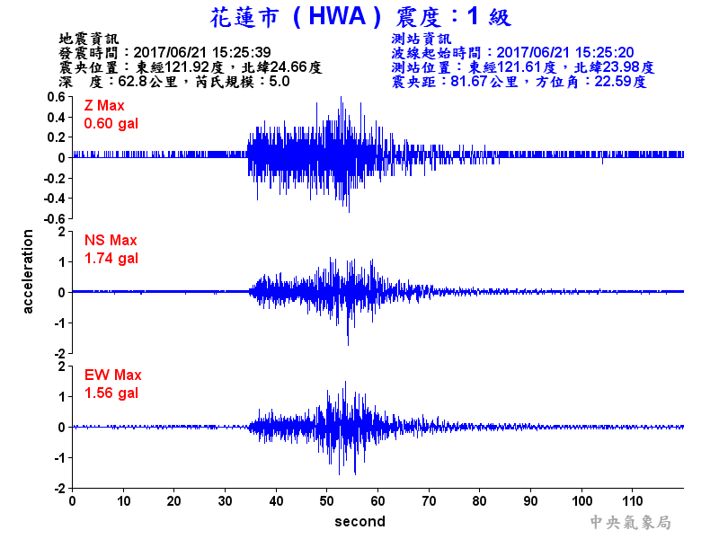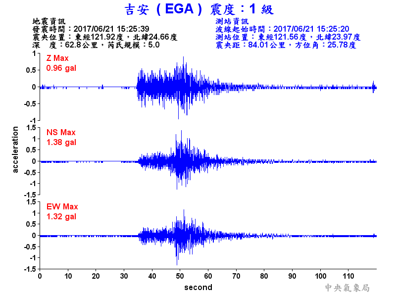 Origin Time:2017/06/21 15:25:39 Lon:121.92°E Lat:24.66°N Depth:62.8km