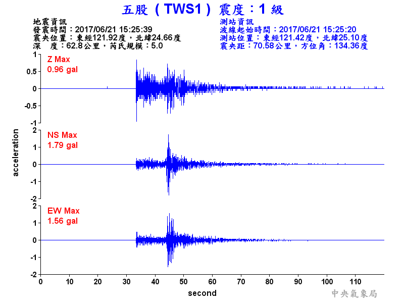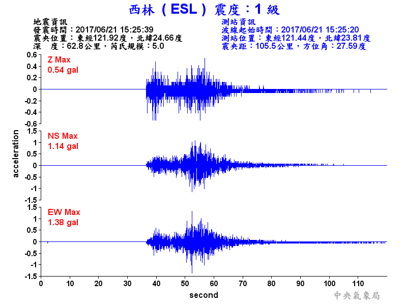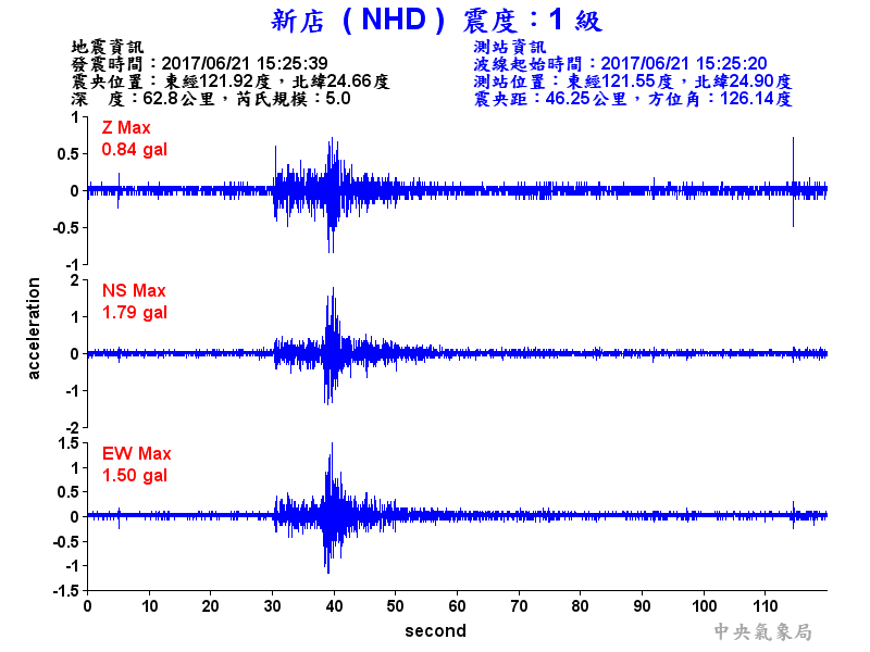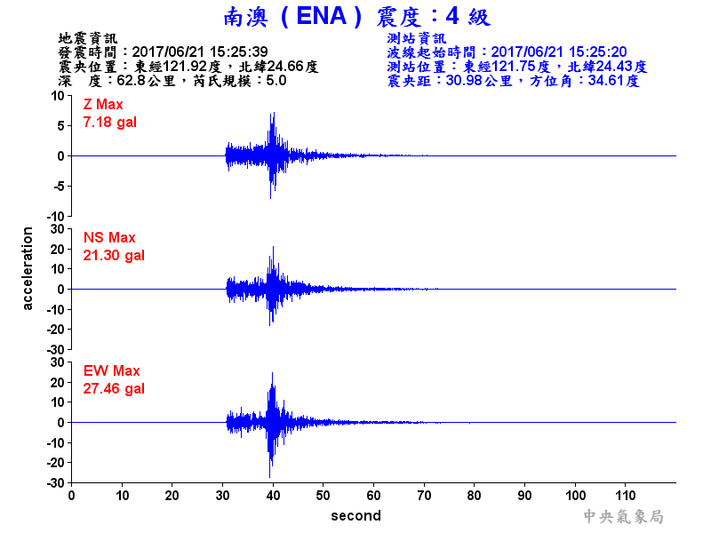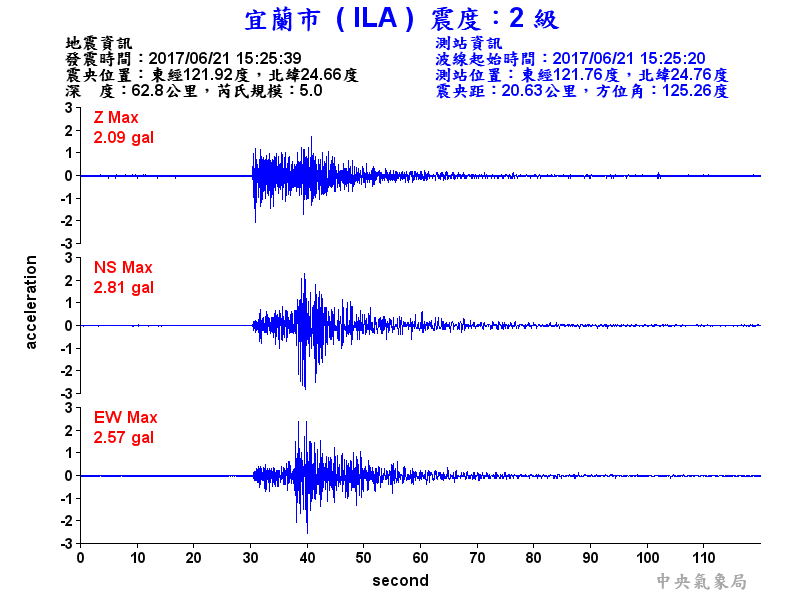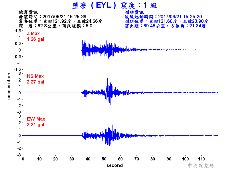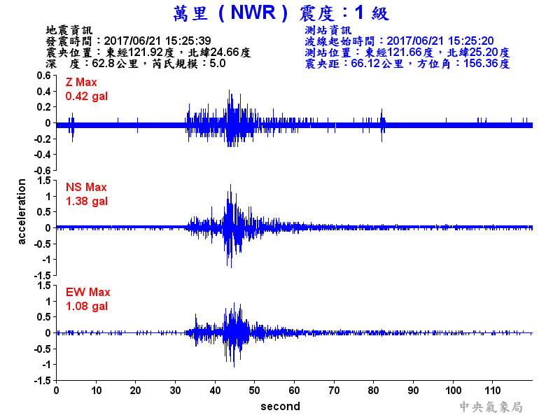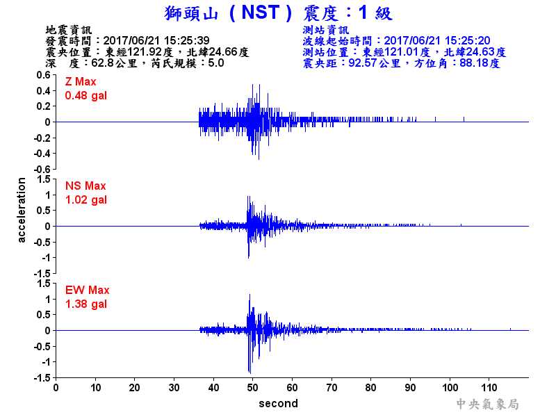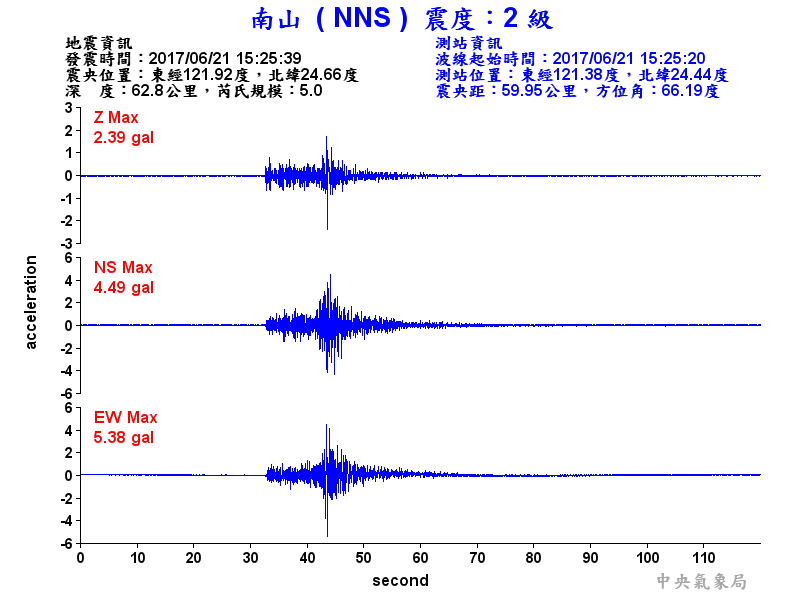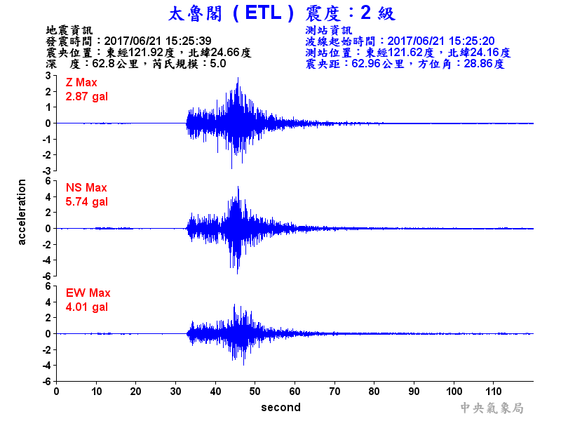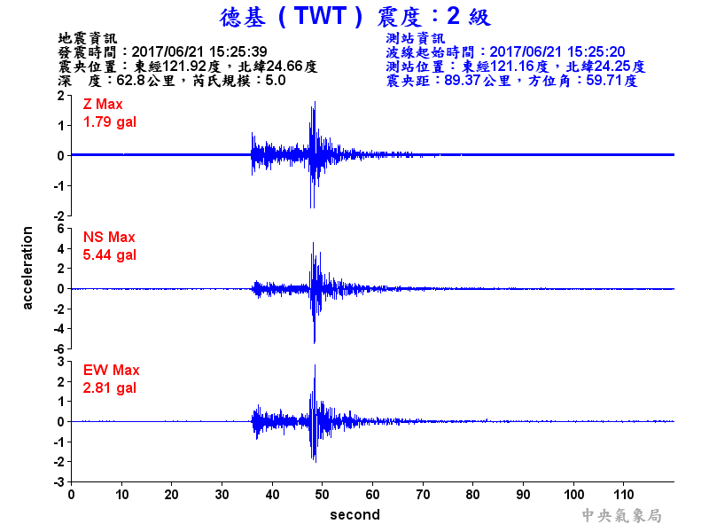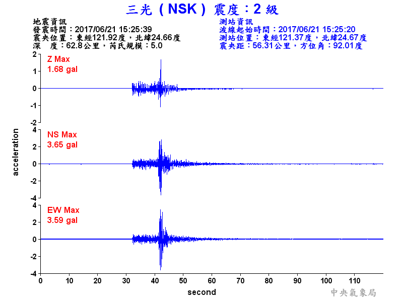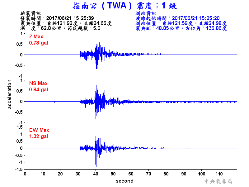 Origin Time:2017/06/21 15:25:39 Lon:121.92°E Lat:24.66°N Depth:62.8km