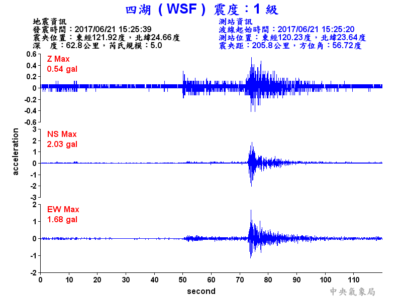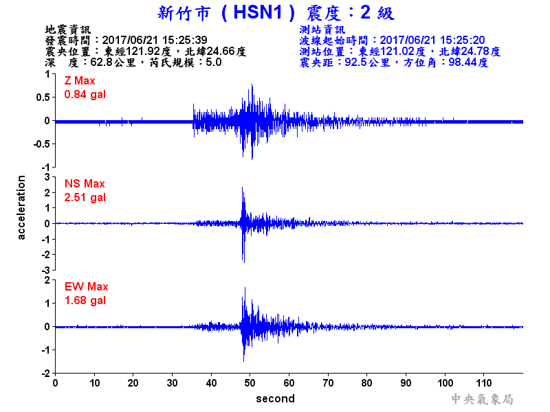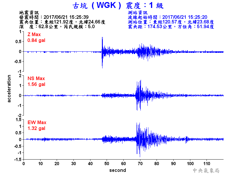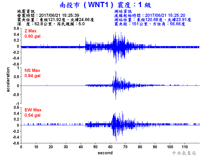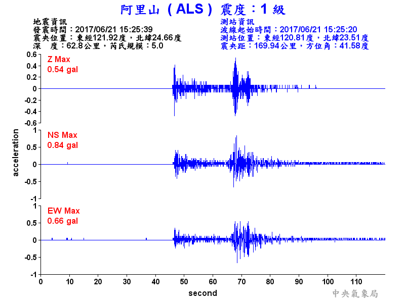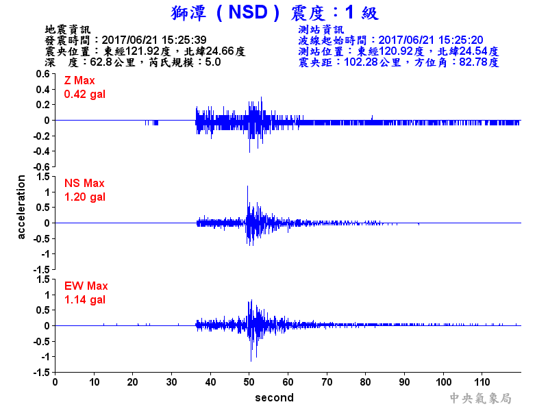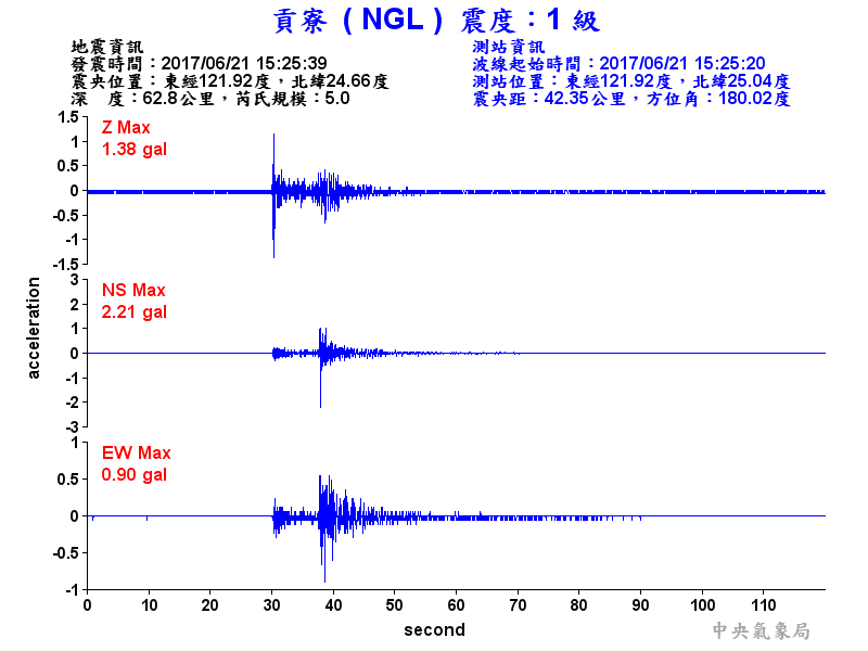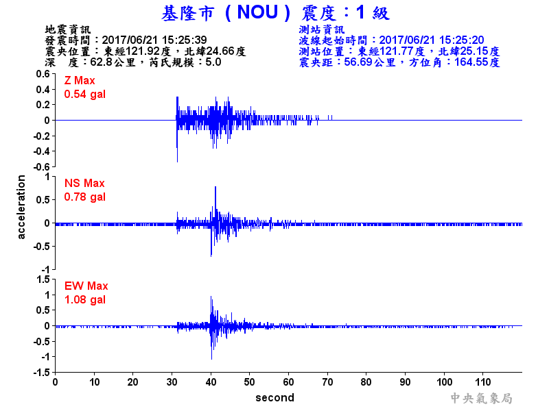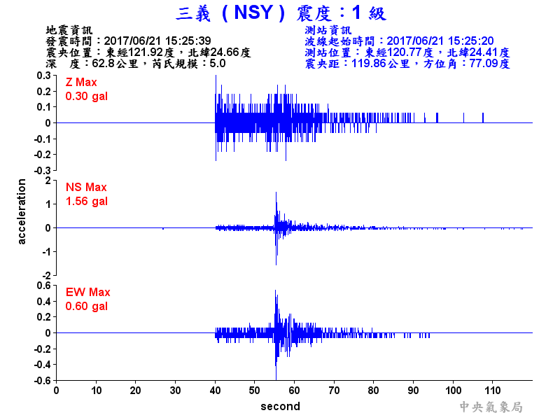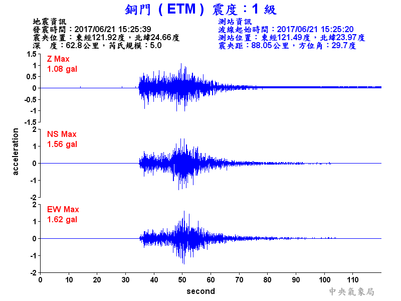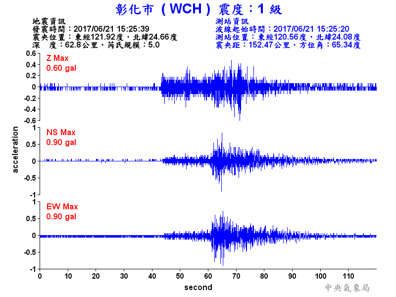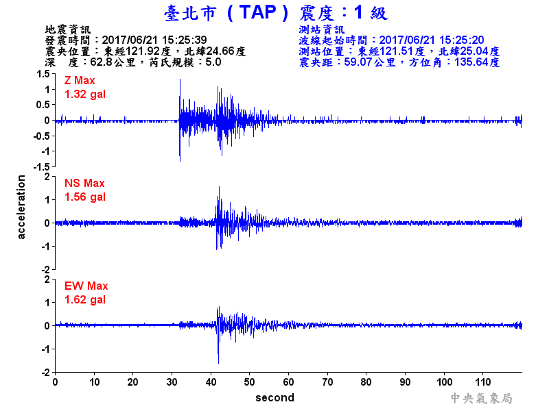 Origin Time:2017/06/21 15:25:39 Lon:121.92°E Lat:24.66°N Depth:62.8km