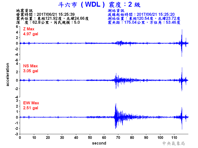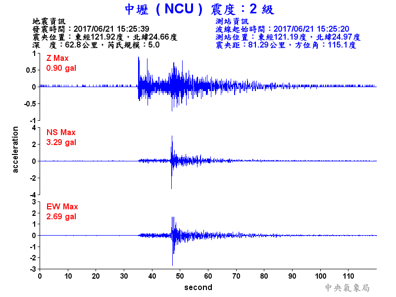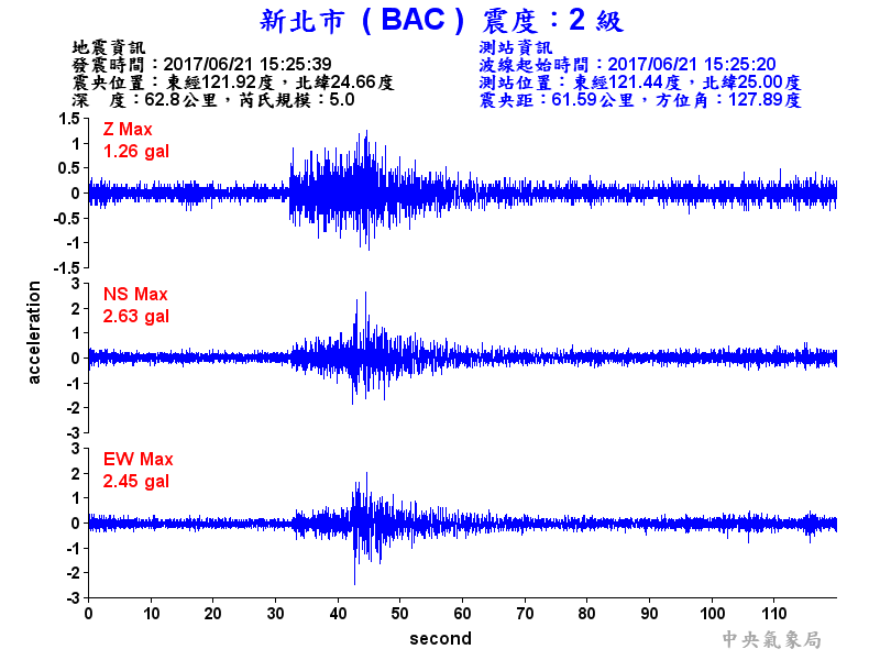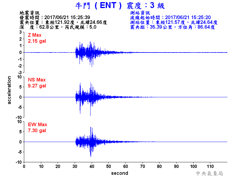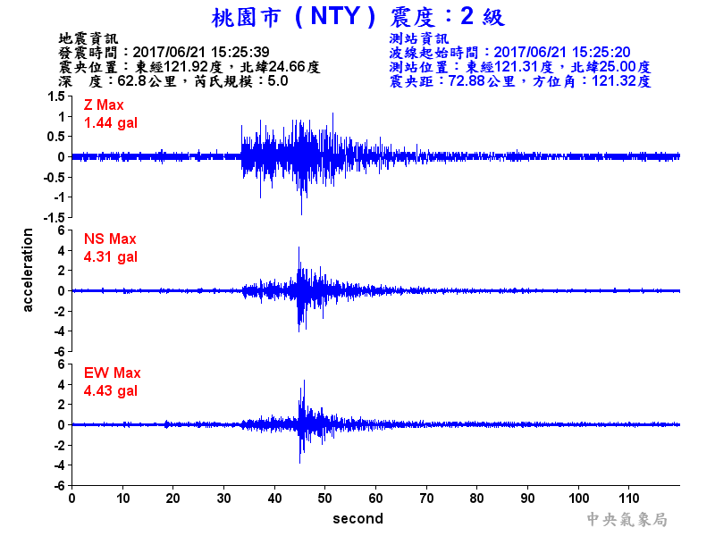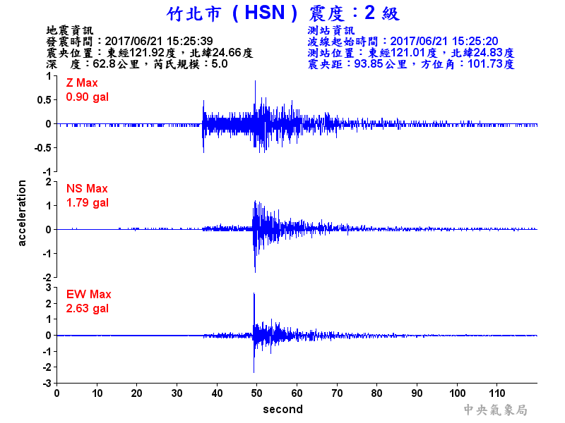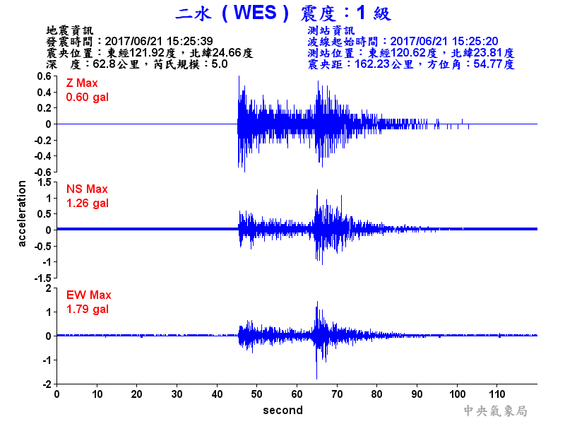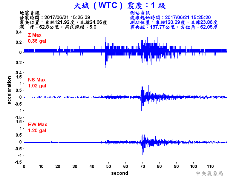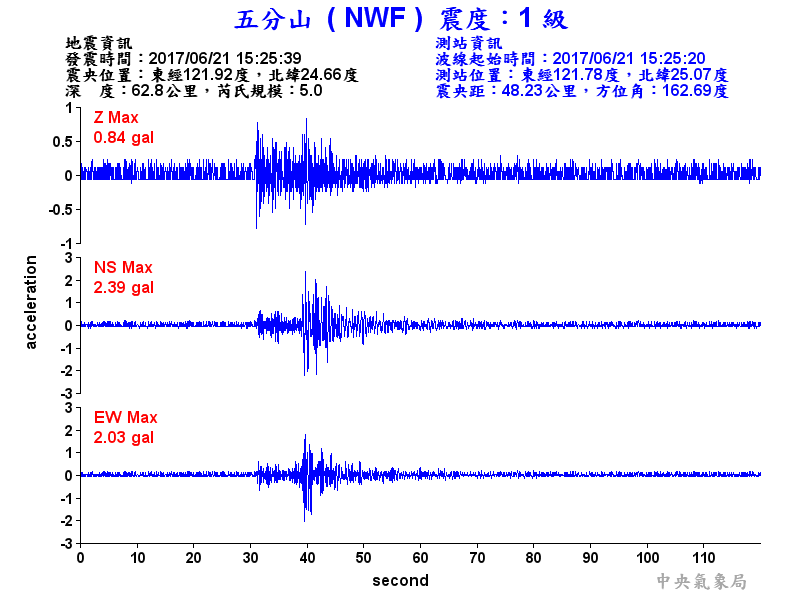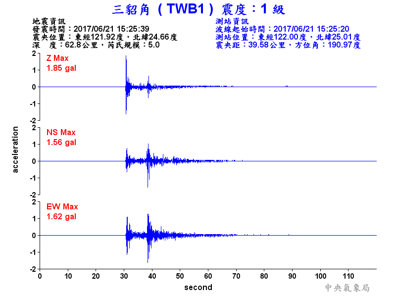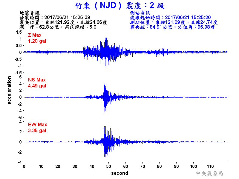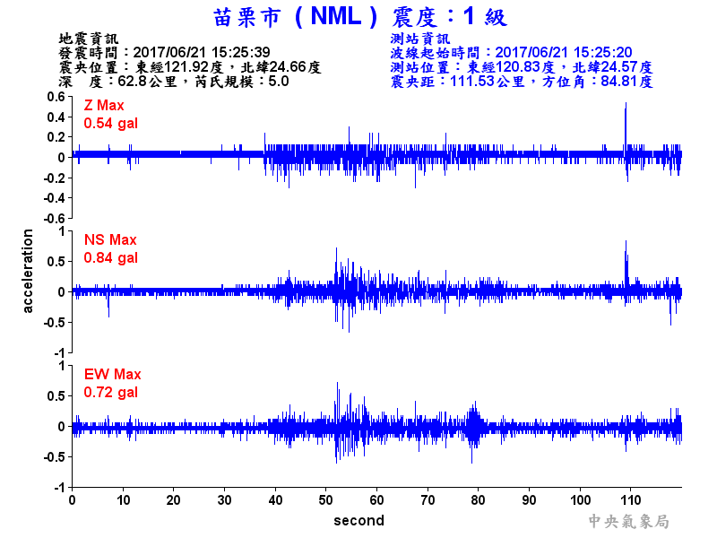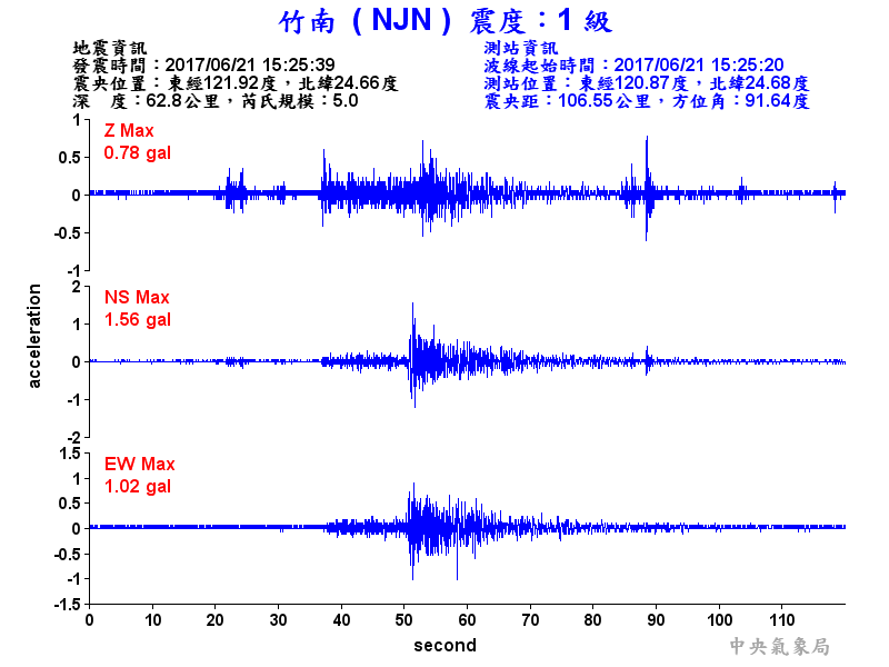 Origin Time:2017/06/21 15:25:39 Lon:121.92°E Lat:24.66°N Depth:62.8km