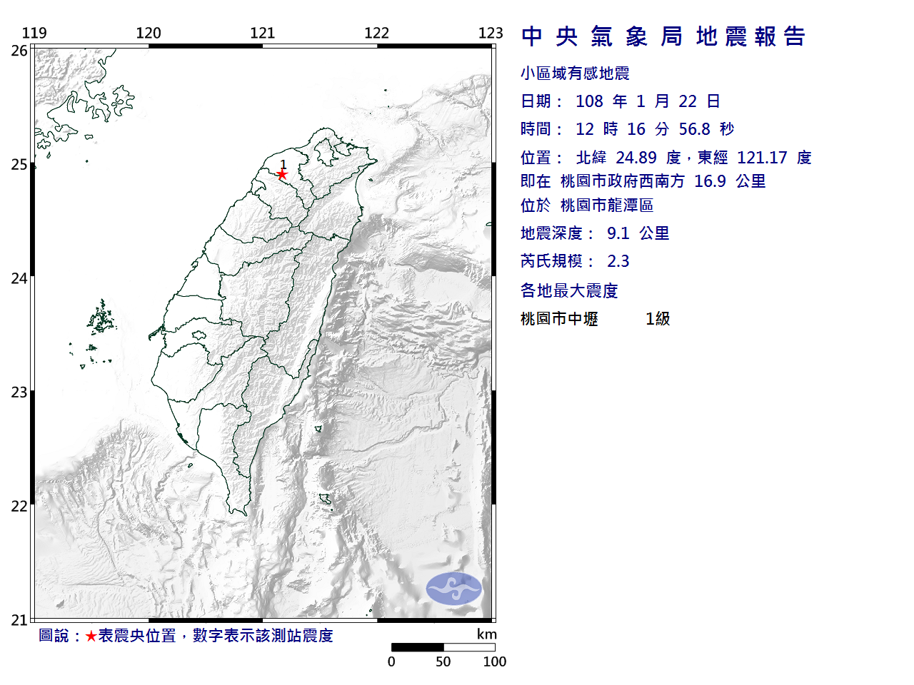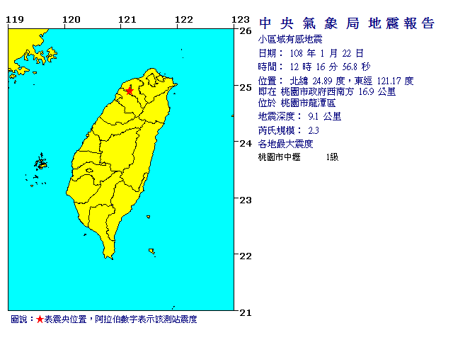 1月22日12時16分 規模 2.3 桃園市政府西南方 16.9 公里 (位於桃園市龍潭區)
