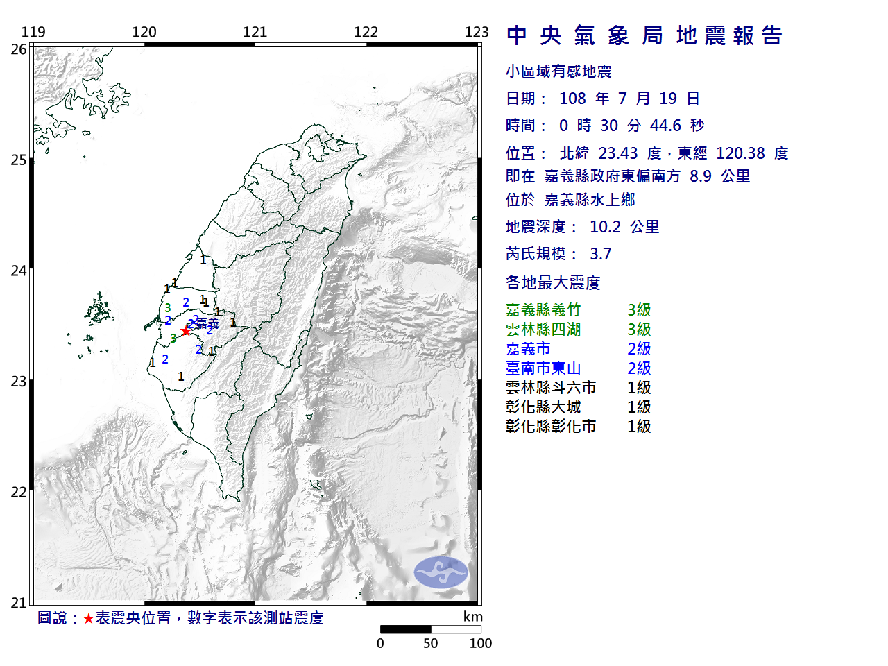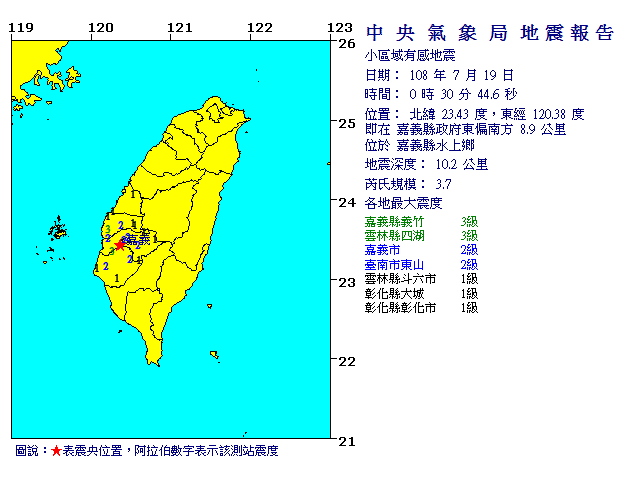 | 發 震 時 間: | 108年 7月19日 0時30分44.6秒 |