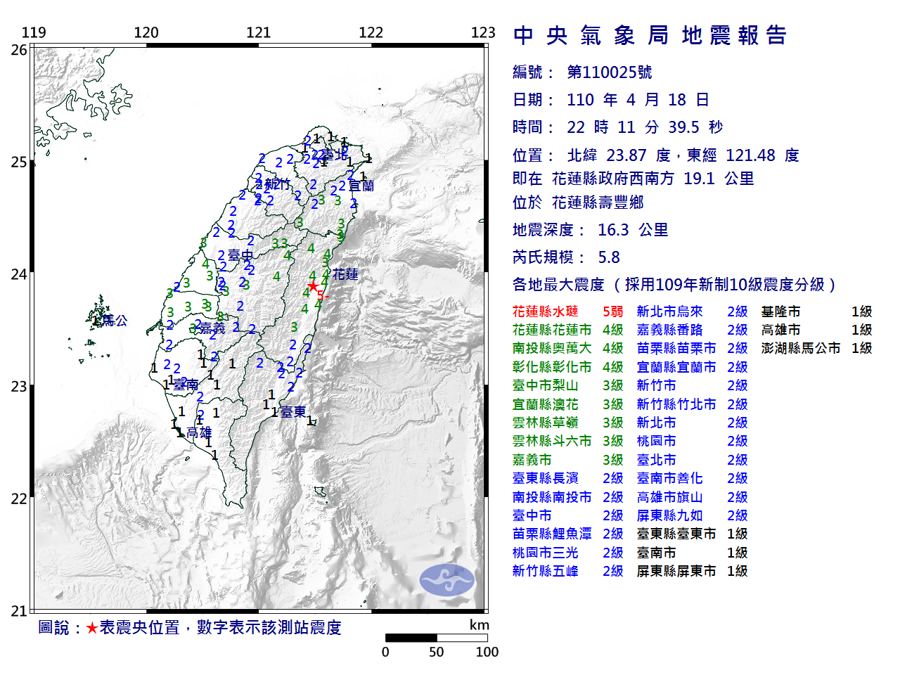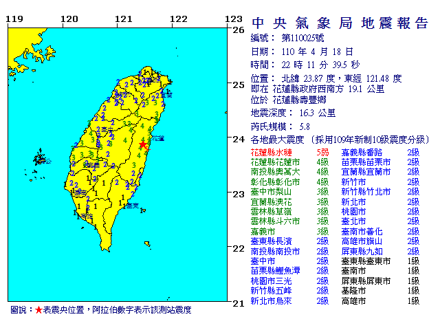 | 發 震 時 間: | 110年 4月18日22時11分39.5秒 |