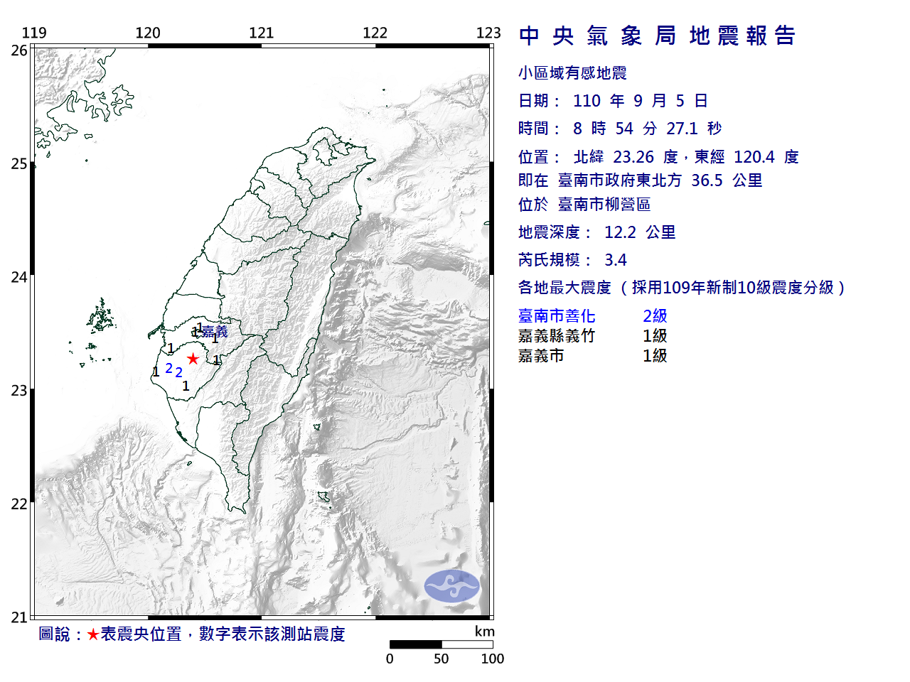 | 臺南市地區最大震度 2級 | 嘉義縣地區最大震度 1級 | 嘉義市地區最大震度 1級 |