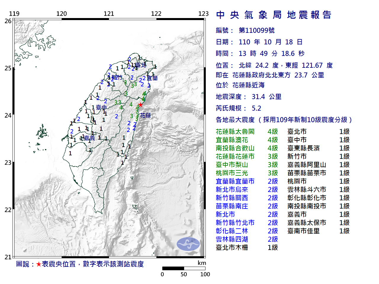 | 中央氣象局地震測報中心 第099號有感地震報告 |