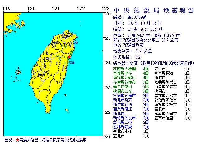 | 發 震 時 間: | 110年10月18日13時49分18.6秒 |