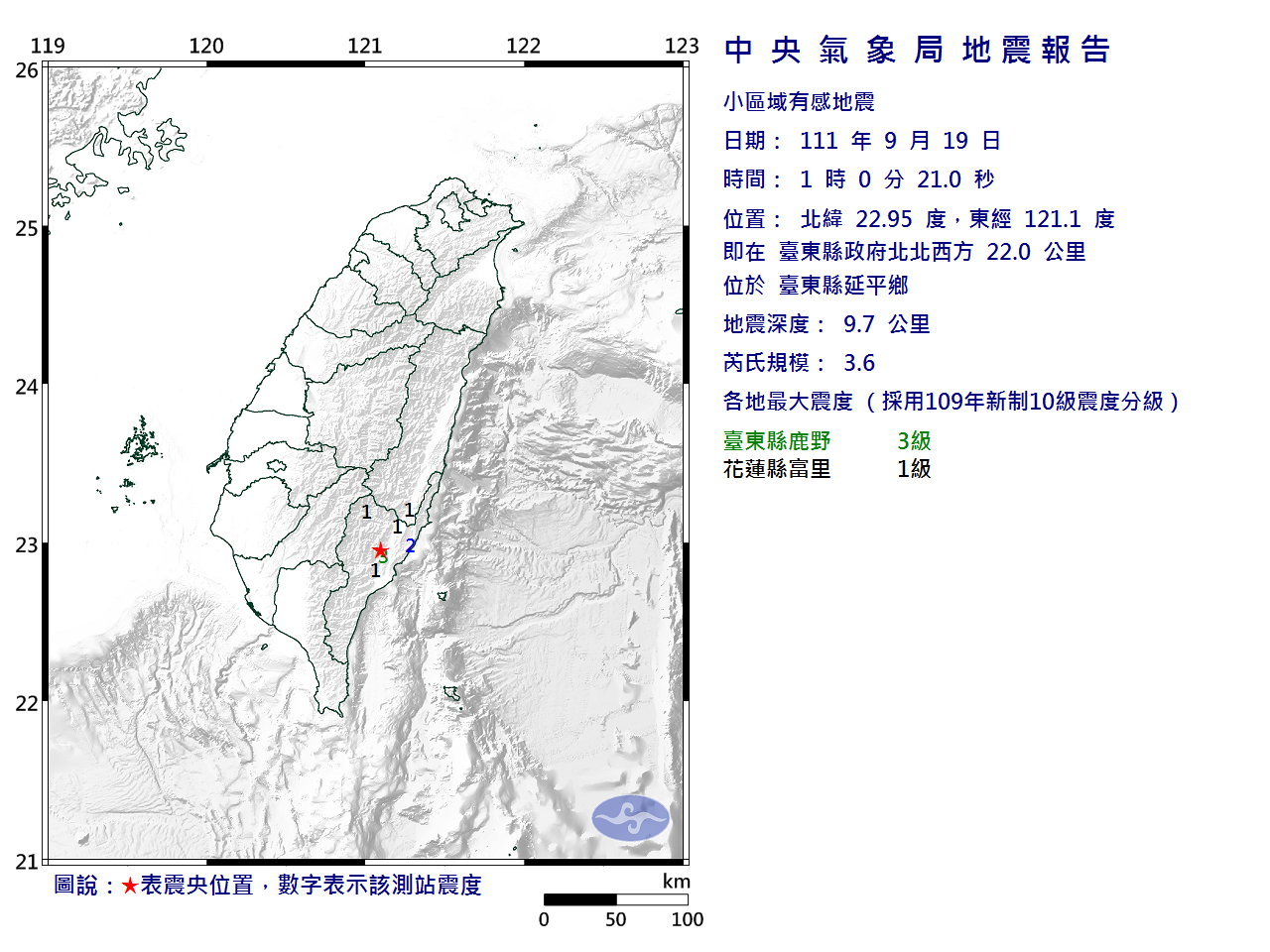 9月19日1時0分 規模 3.6 臺東縣政府北北西方 22.0 公里 (位於臺東縣延平鄉)