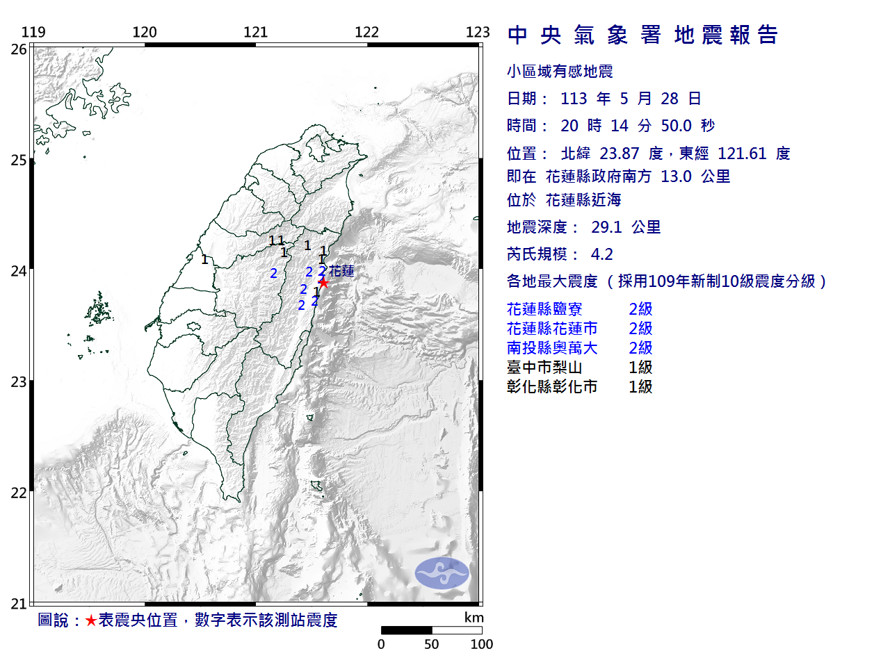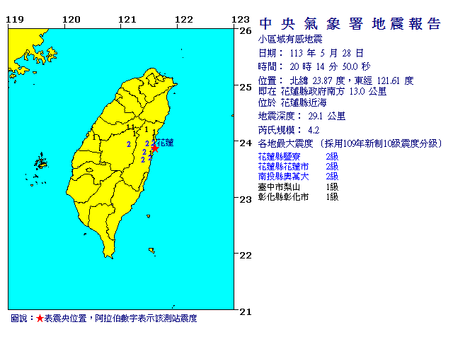 | 發 震 時 間: | 113年 5月28日20時14分50.0秒 |