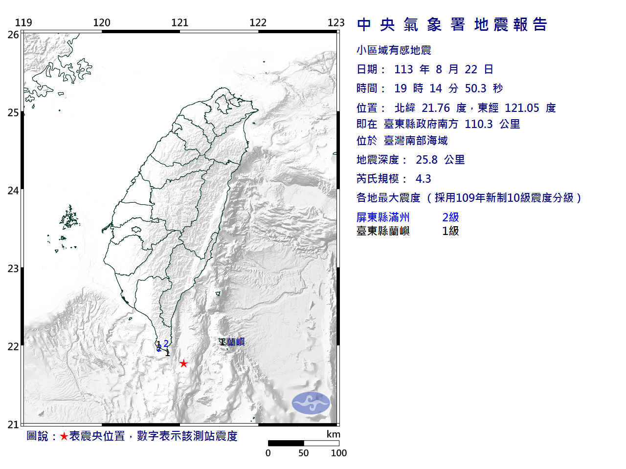 8月22日19時14分 規模 4.3 臺東縣政府南方 110.3 公里 (位於臺灣南部海域)
