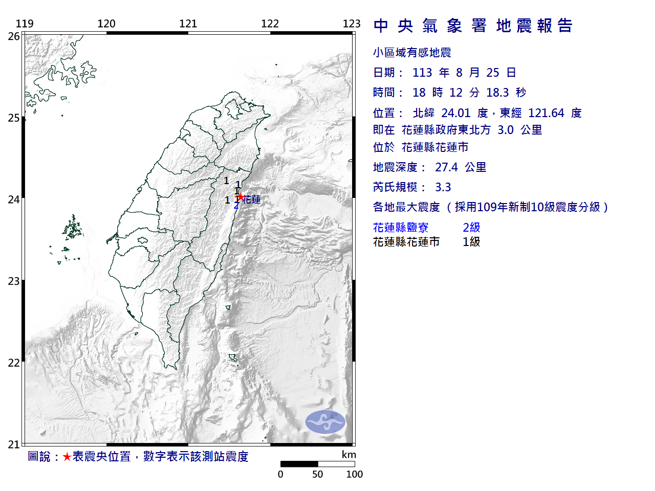 8月25日18時12分 規模 3.3 花蓮縣政府東北方 3.0 公里 (位於花蓮縣花蓮市)