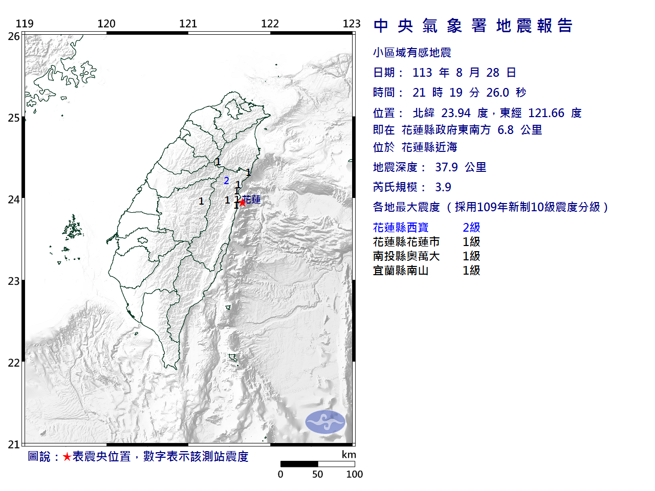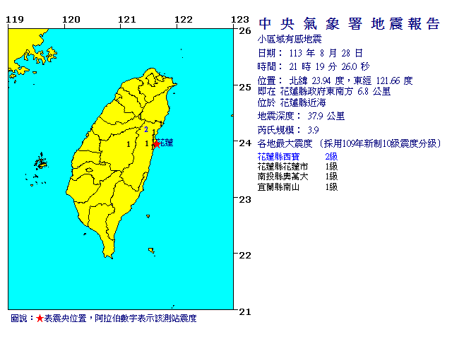 | 發 震 時 間: | 113年 8月28日21時19分26.0秒 |