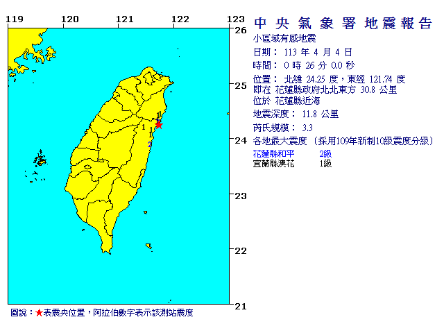 發 震 時 間: | 113年 4月 4日 0時26分 0.0秒 |