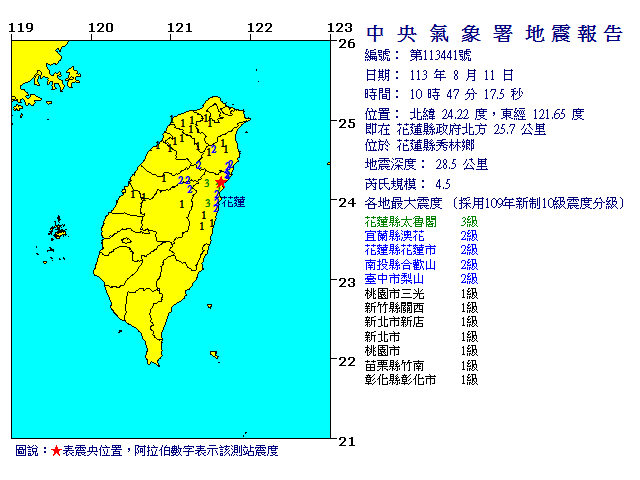 | 發 震 時 間: | 113年 8月11日10時47分17.5秒 |