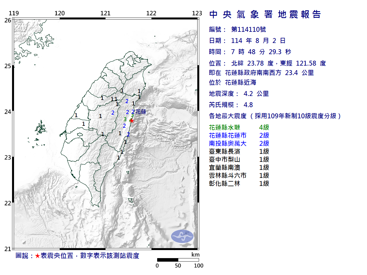 發 震 時 間: | 114年 8月 2日 7時48分29.3秒 |