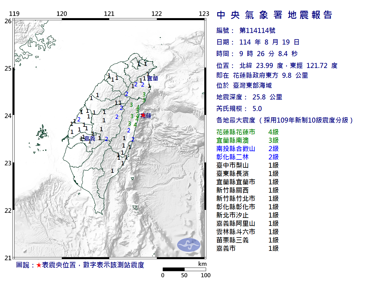 花蓮縣地區最大震度 4級 | 宜蘭縣地區最大震度 3級 | 南投縣地區最大震度 2級 |
