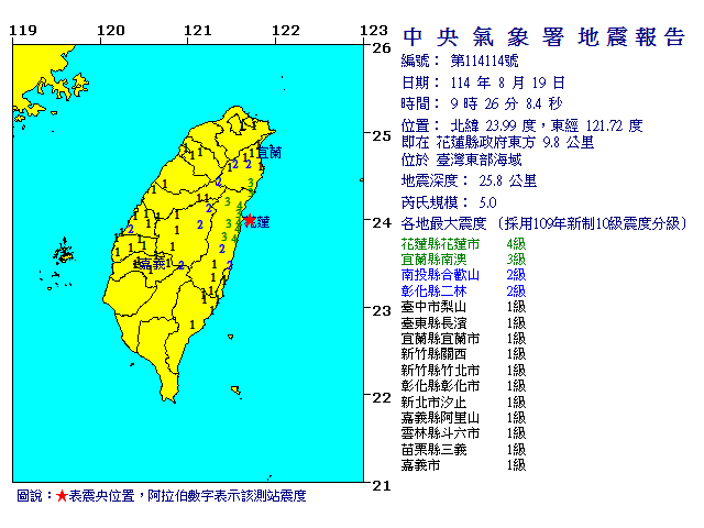 發 震 時 間: | 114年 8月19日 9時26分 8.4秒 |