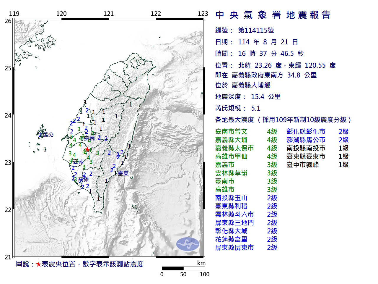 嘉義市地區最大震度 3級 | 雲林縣地區最大震度 3級 | 南投縣地區最大震度 2級 |