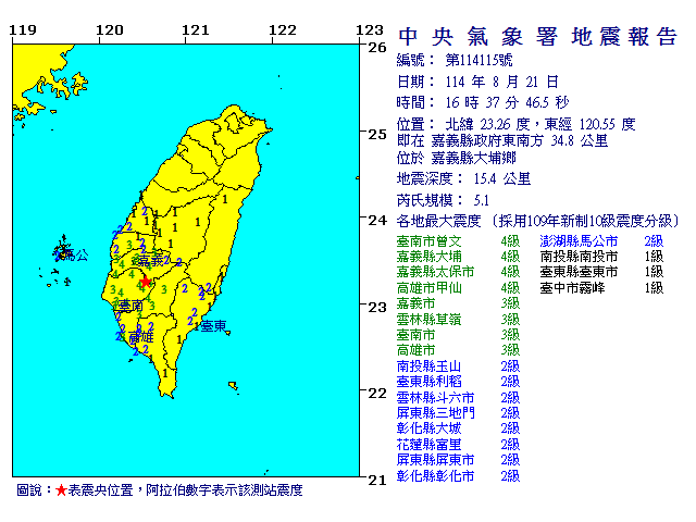 發 震 時 間: | 114年 8月21日16時37分46.5秒 |