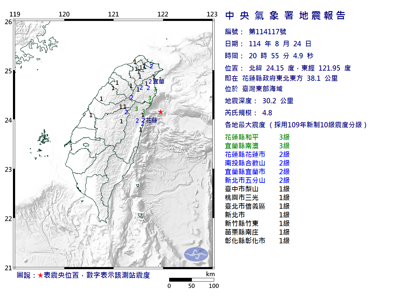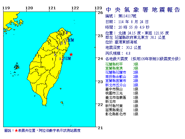發 震 時 間: | 114年 8月24日20時55分 4.9秒 |