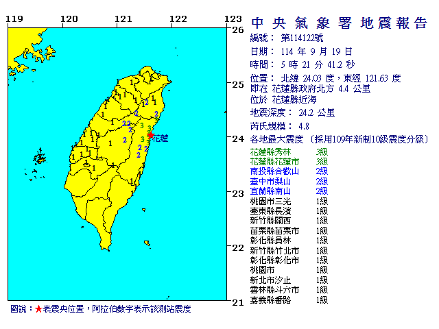 | 發 震 時 間: | 114年 9月19日 5時21分41.2秒 |