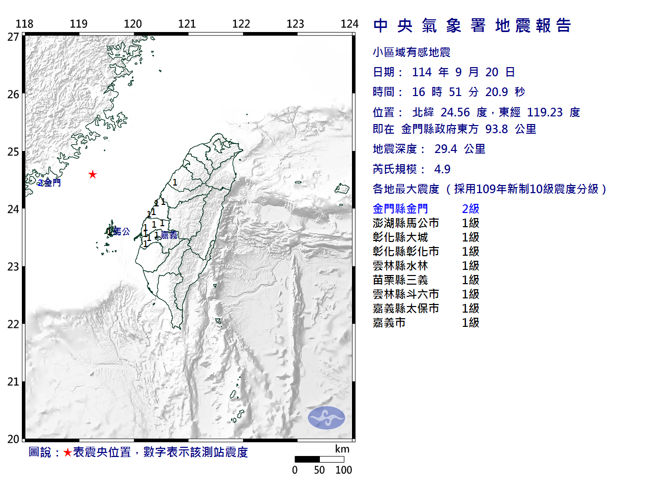 | 金門縣地區最大震度 2級 | 澎湖縣地區最大震度 1級 | 彰化縣地區最大震度 1級 |