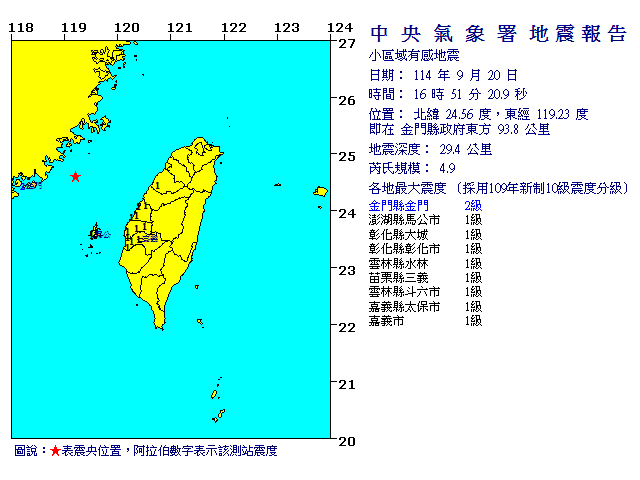 | 發 震 時 間: | 114年 9月20日16時51分20.9秒 |