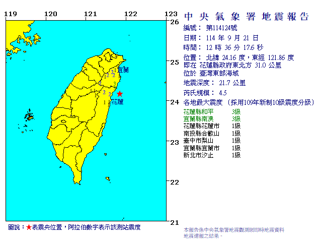 發 震 時 間: | 114年 9月21日12時36分17.6秒 |