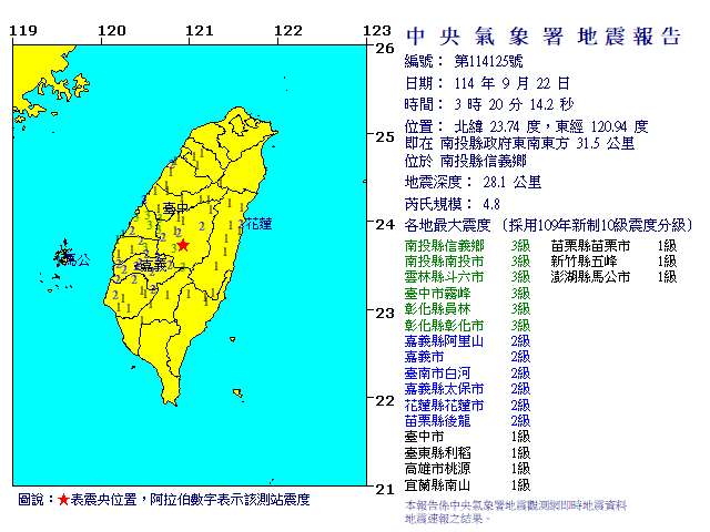 發 震 時 間: | 114年 9月22日 3時20分14.2秒 |