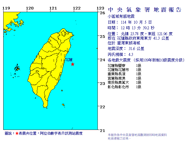 發 震 時 間: | 114年10月 5日12時13分39.2秒 |