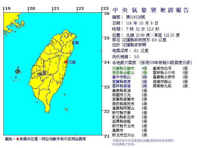 發 震 時 間: | 114年10月 8日 7時52分12.5秒 |