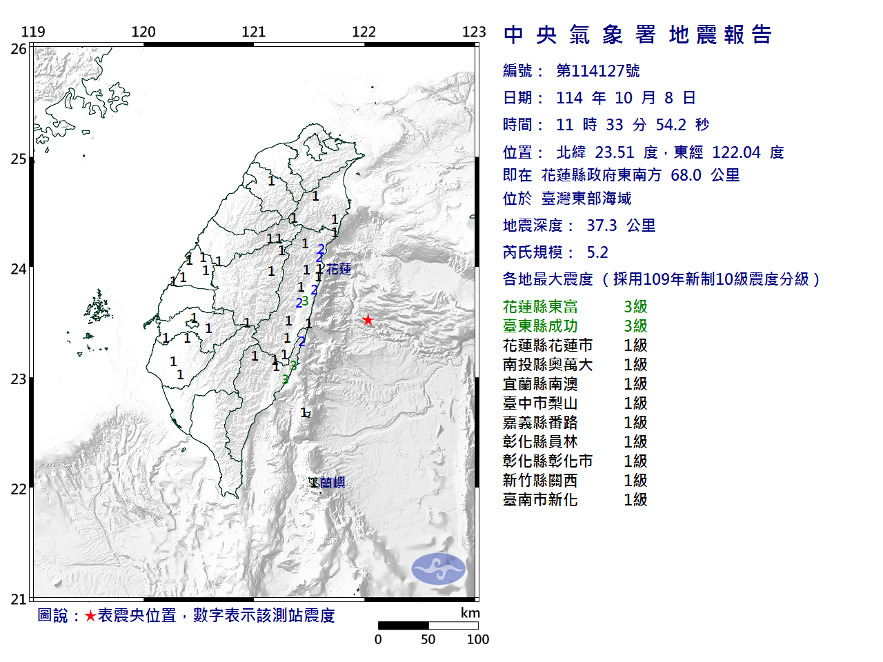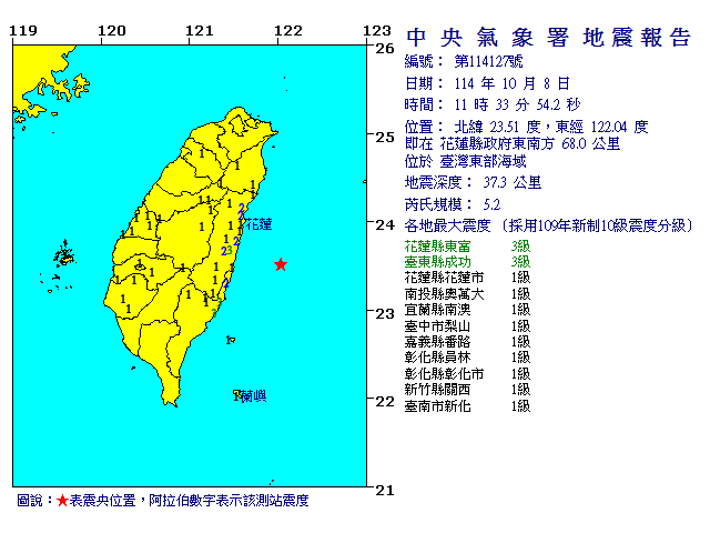 | 發 震 時 間: | 114年10月 8日11時33分54.2秒 |