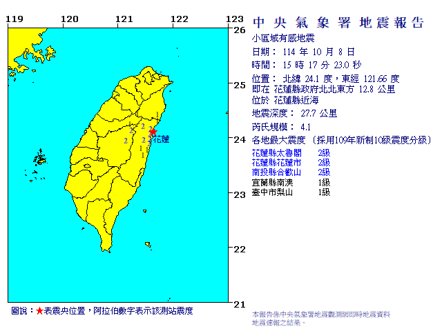 花蓮縣地區最大震度 2級 | 南投縣地區最大震度 2級 | 宜蘭縣地區最大震度 1級 |