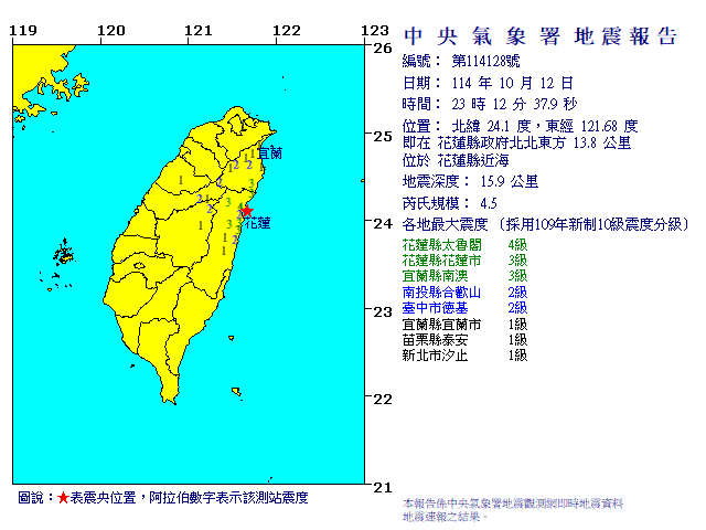| 發 震 時 間: | 114年10月12日23時12分37.9秒 |