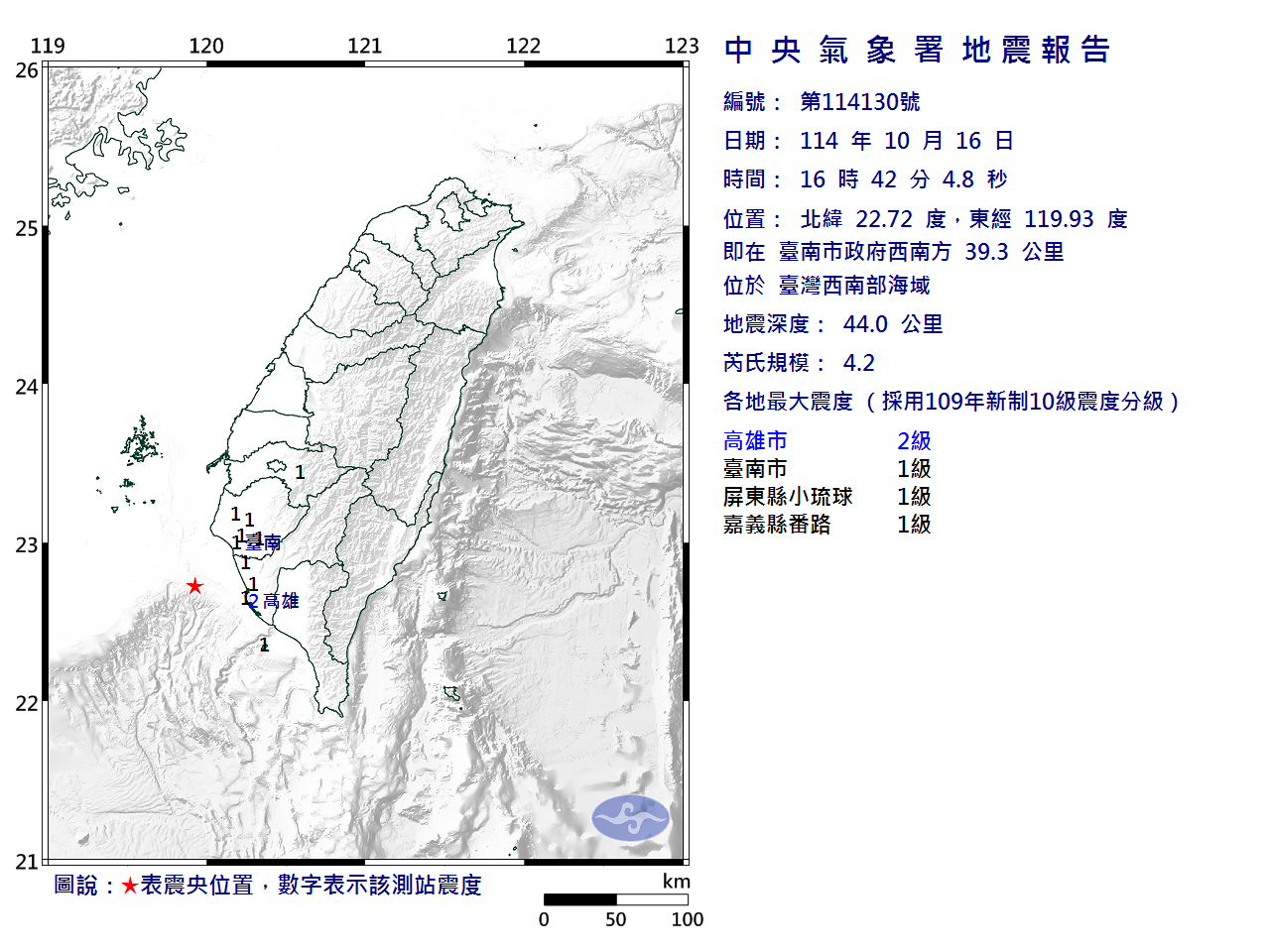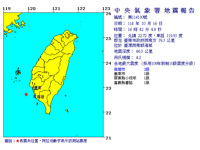 | 發 震 時 間: | 114年10月16日16時42分 4.8秒 |