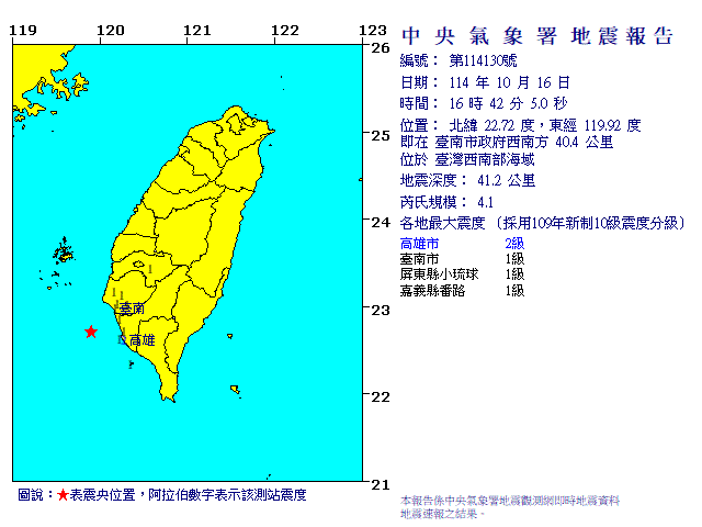 | 發 震 時 間: | 114年10月16日16時42分 5.0秒 |